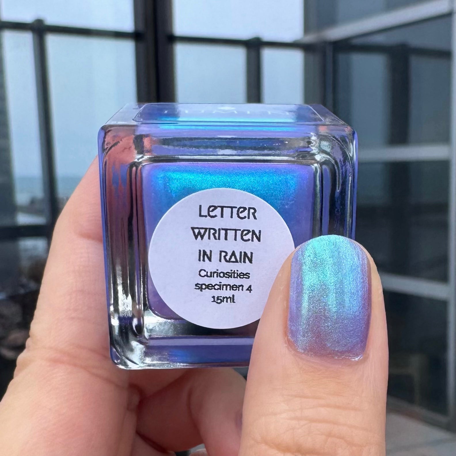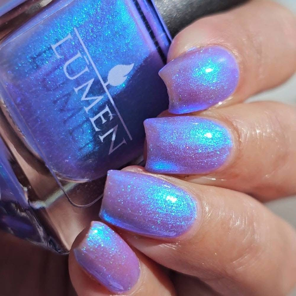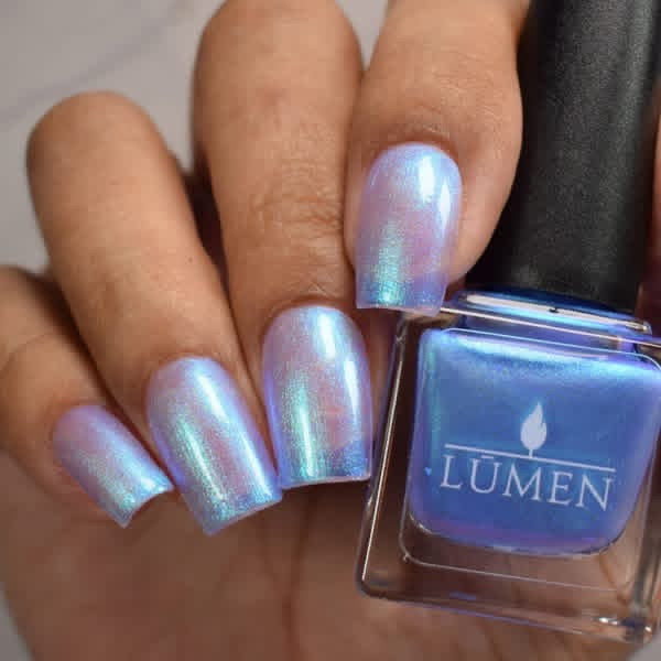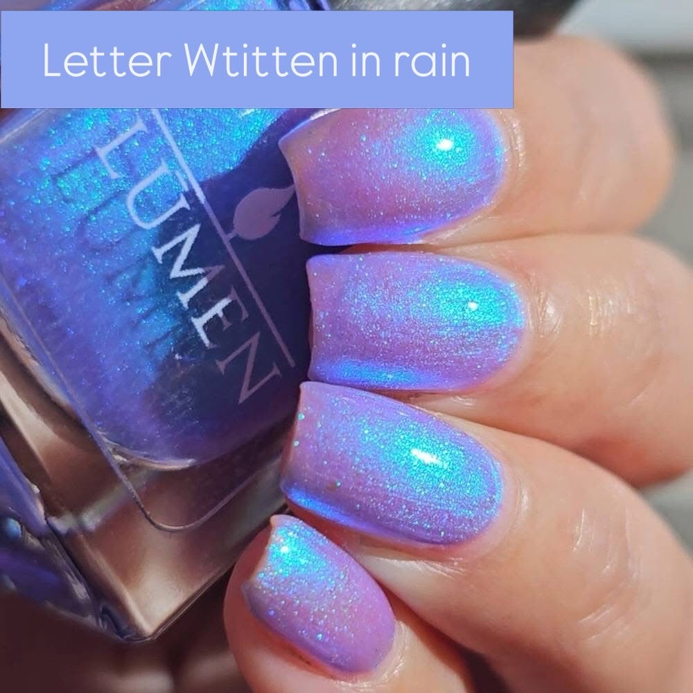 A splash of color, like ink dissolving into memory. Letter Written in Rain is a luminous blue that shifts from blue to green to indigo, catching the light like a story half-told. A blue-to-purple pearl shimmer finish adds depth in the most delicate way.