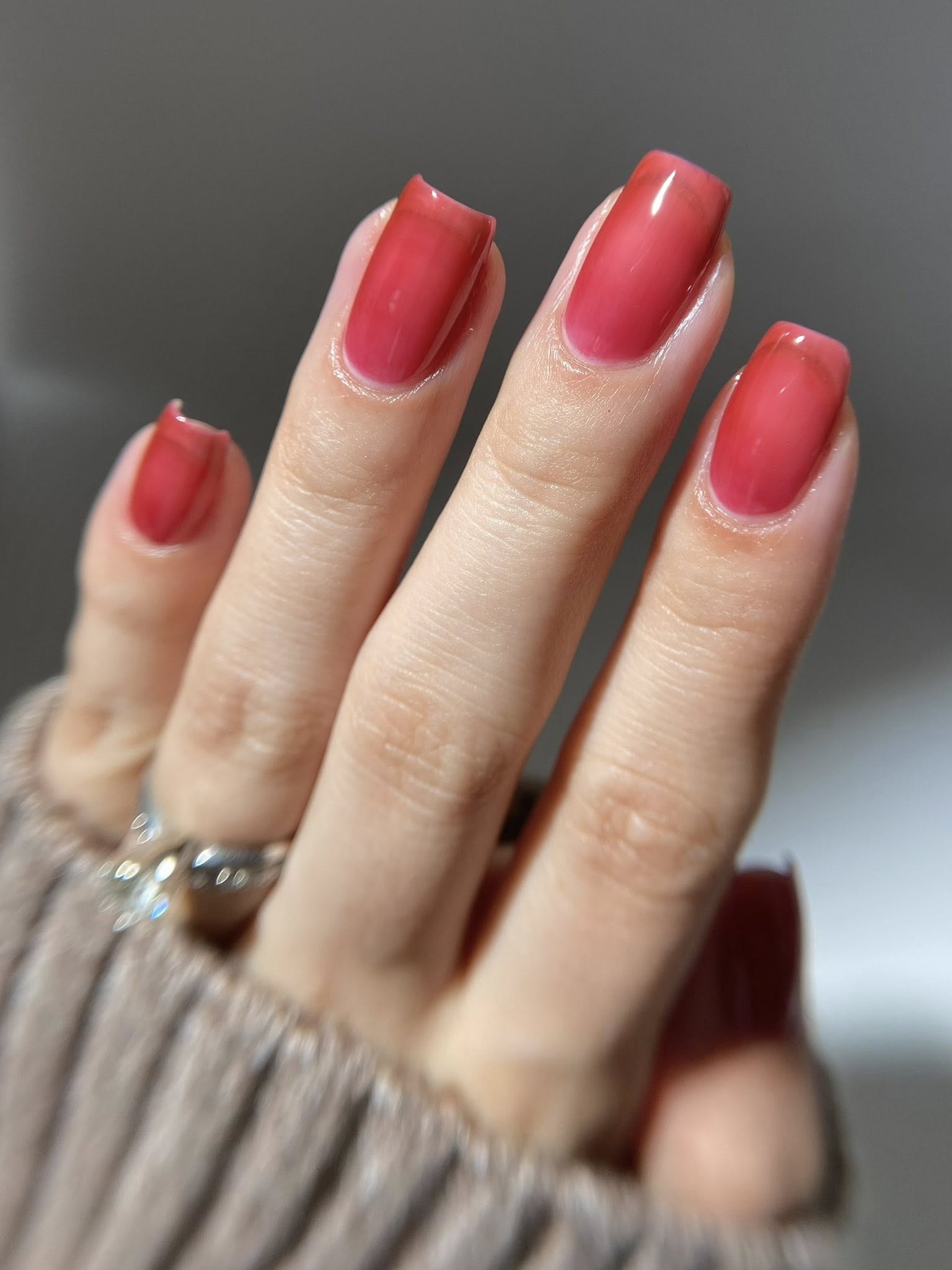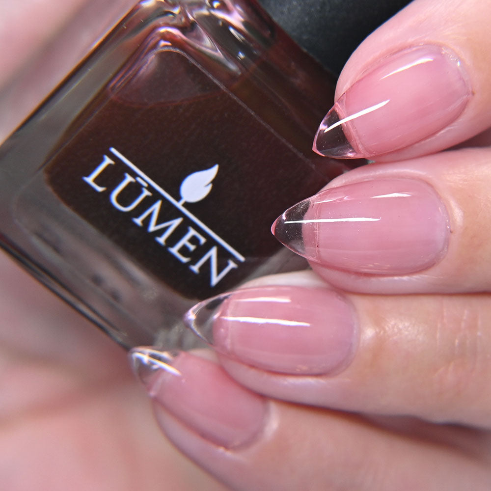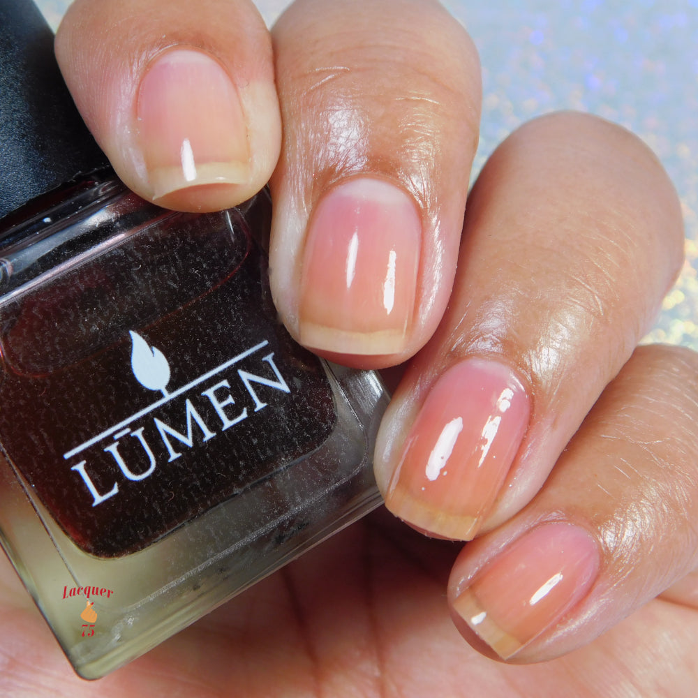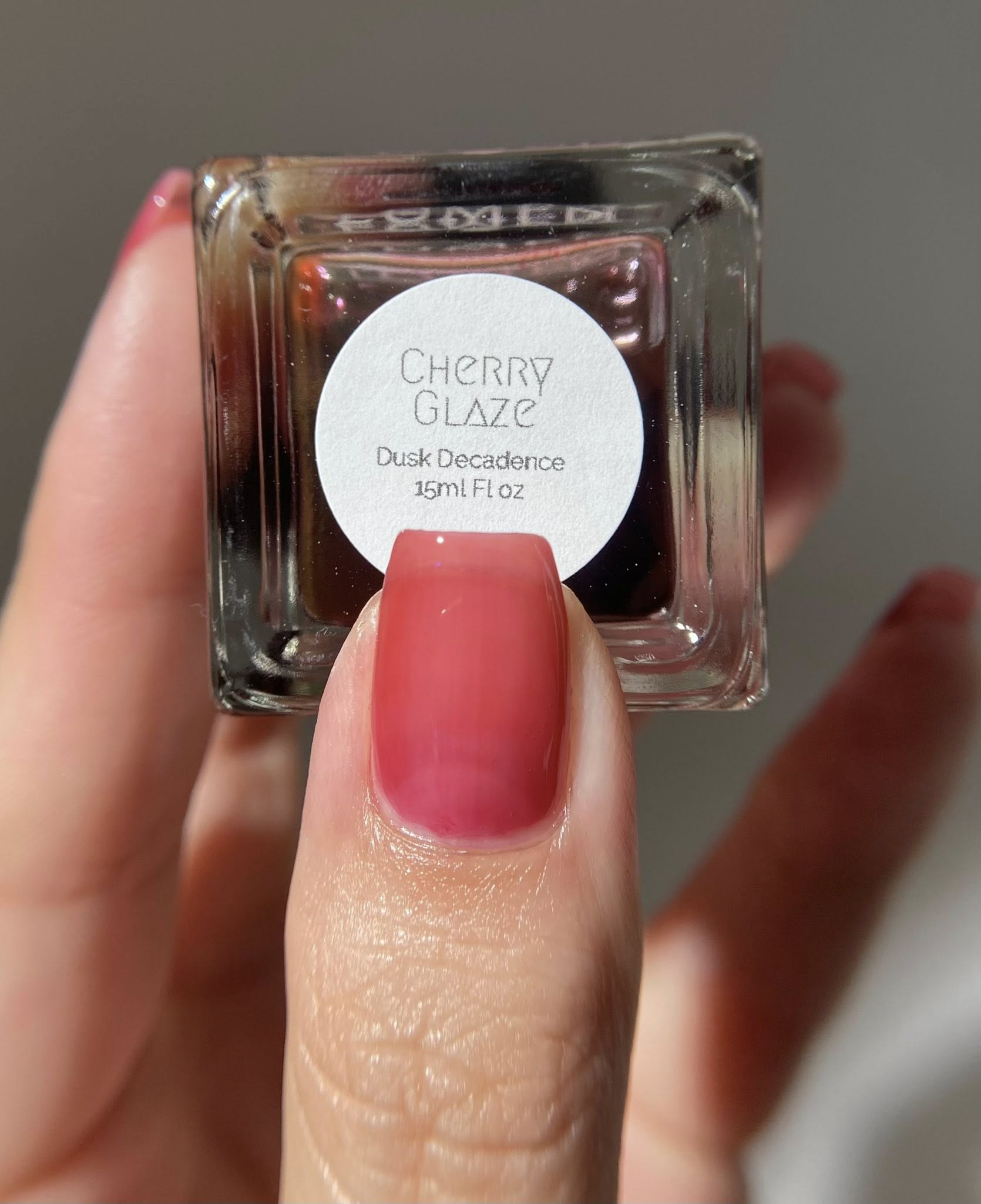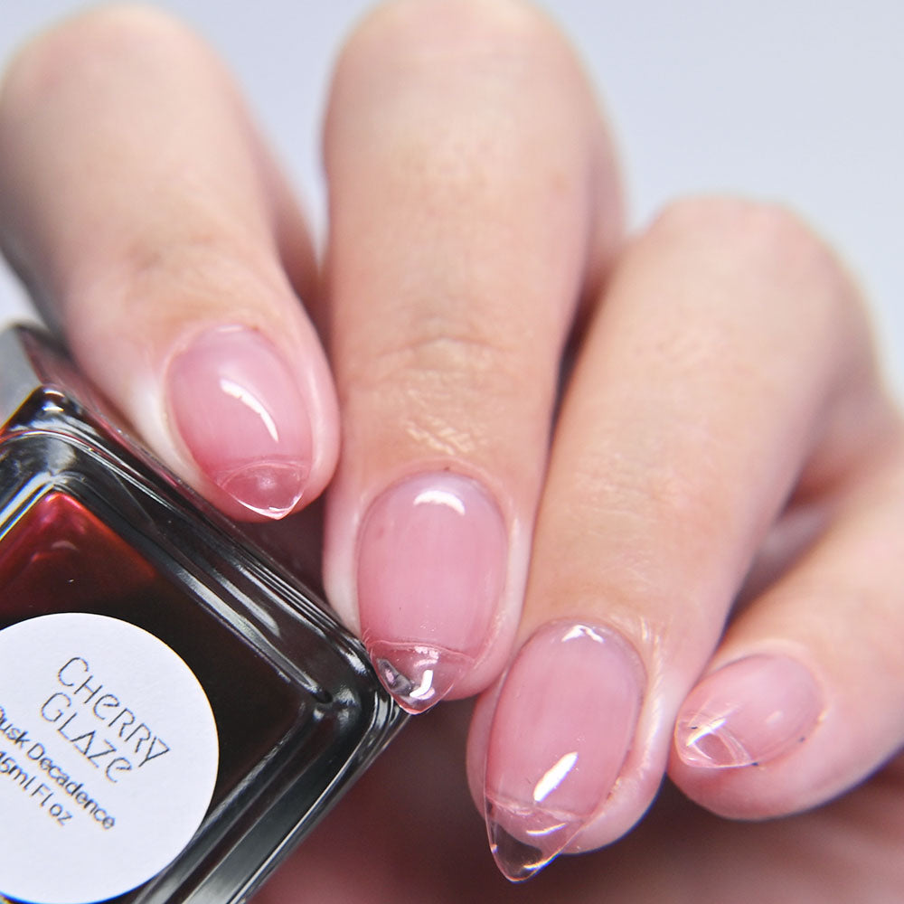 Cherry Glaze Is a scented tinted topcoat with a hint of black cherry color and scent. Wear this glaze for a delicious glossy coat over any shade, or wear it alone for a subtle color over natural nails.