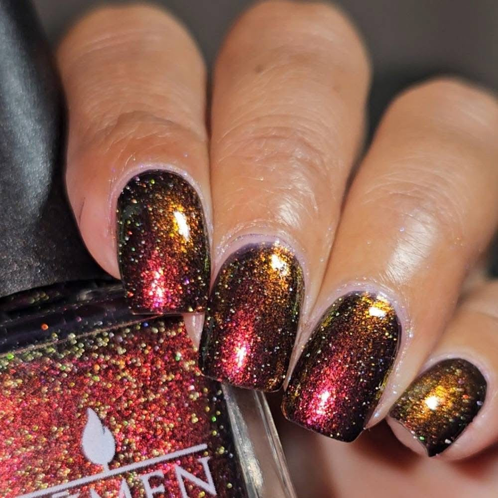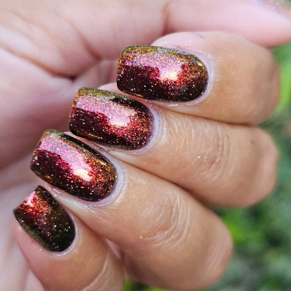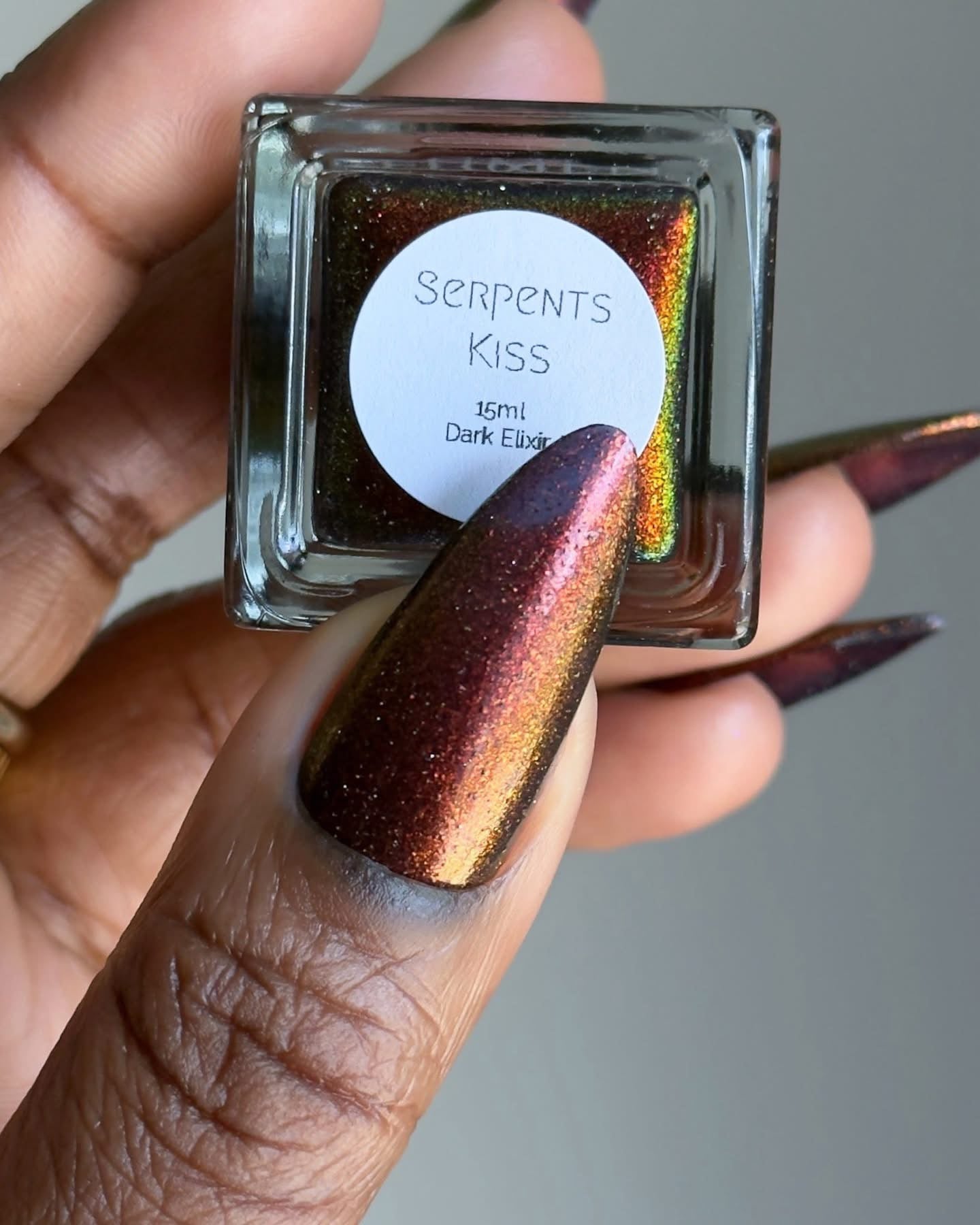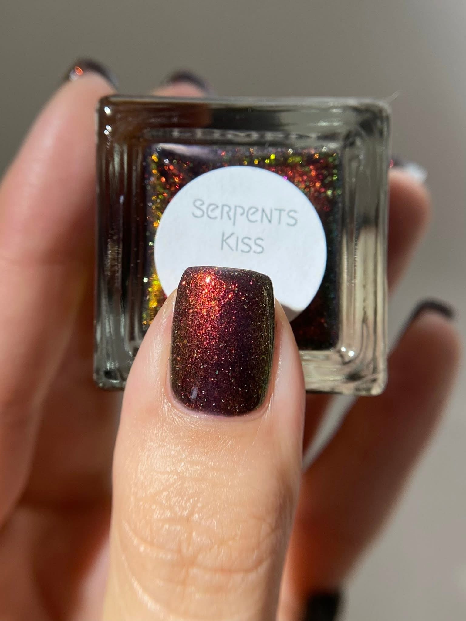 Serpents Kiss: A shimmering indigo jelly with a red to gold to green shift and reflective glitter— reptilian, slinky, and hypnotic under firelight or flash.