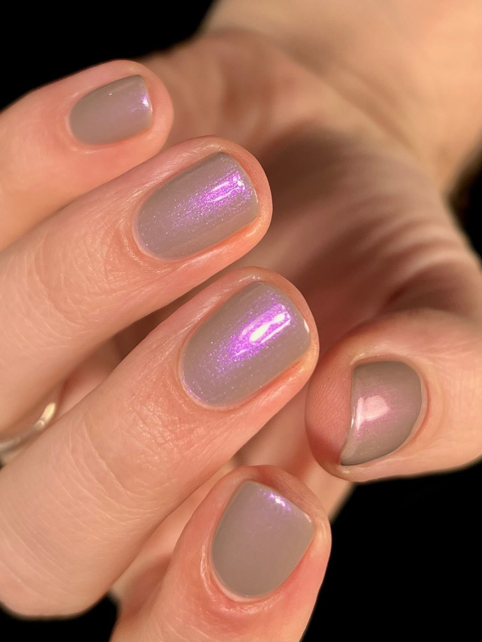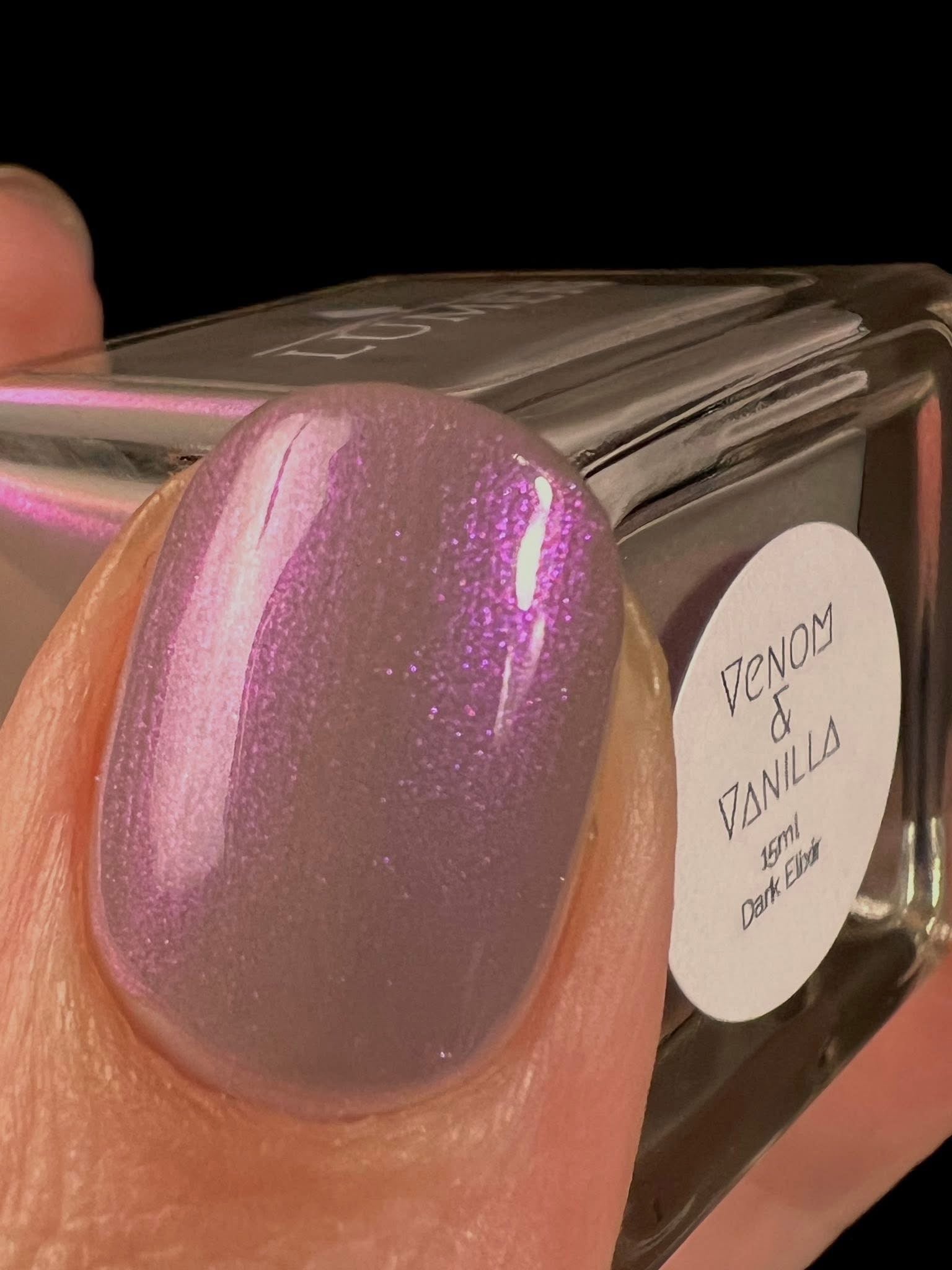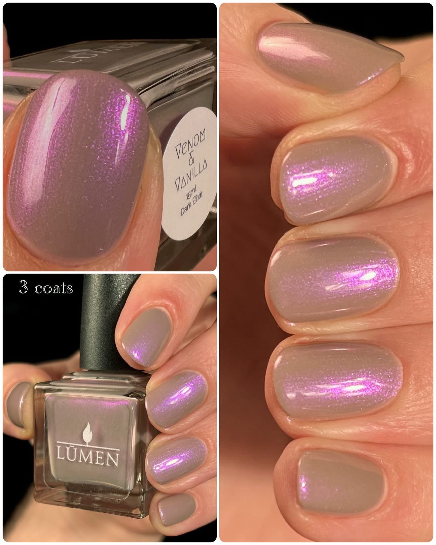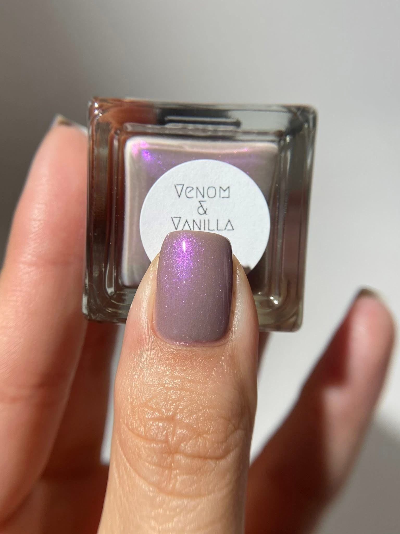 Venom & Vanilla is a smoky taupe-grey with a ghostly purple pearl shimmer. Equal parts dangerous and divine — soft with a bite