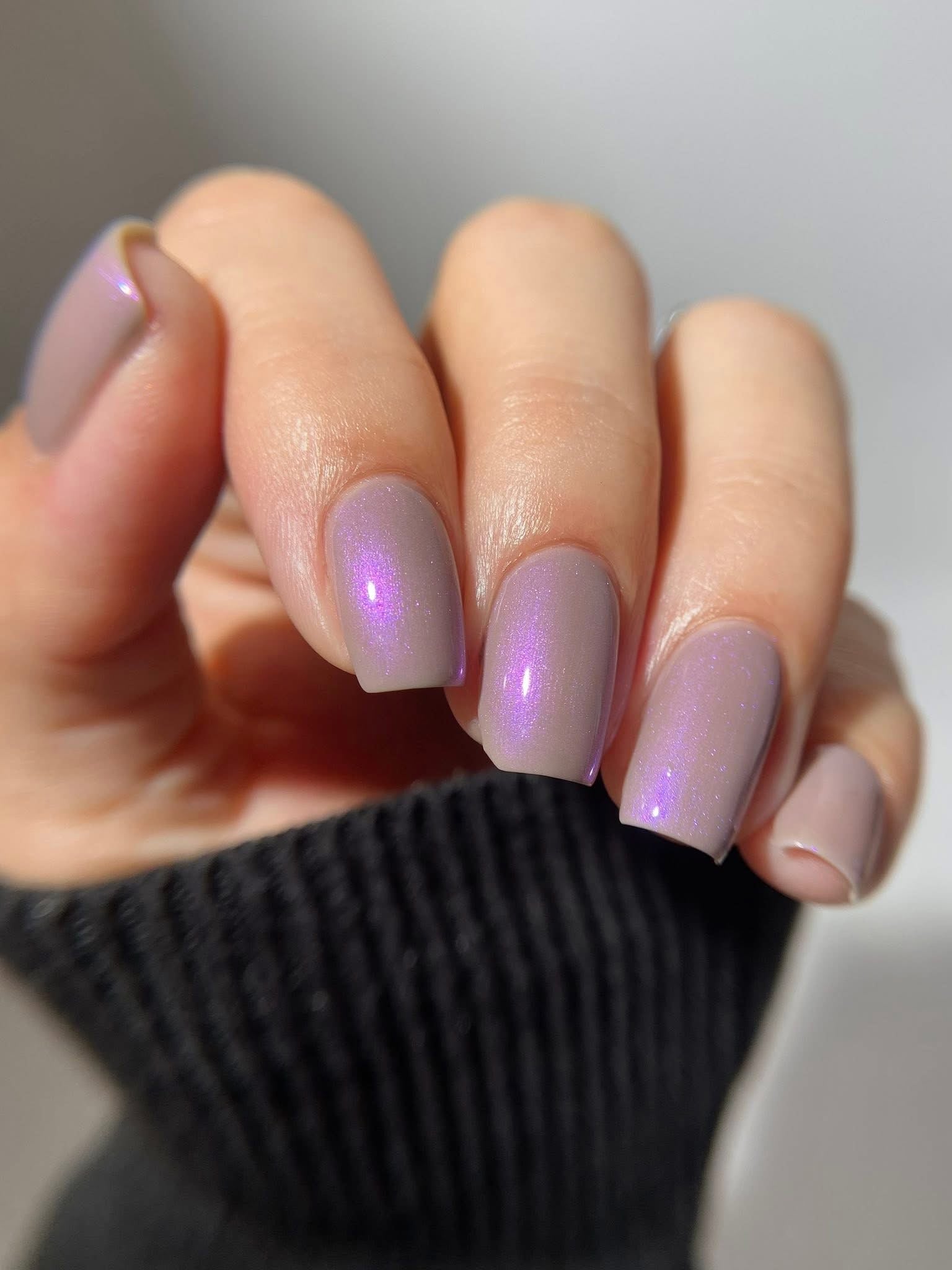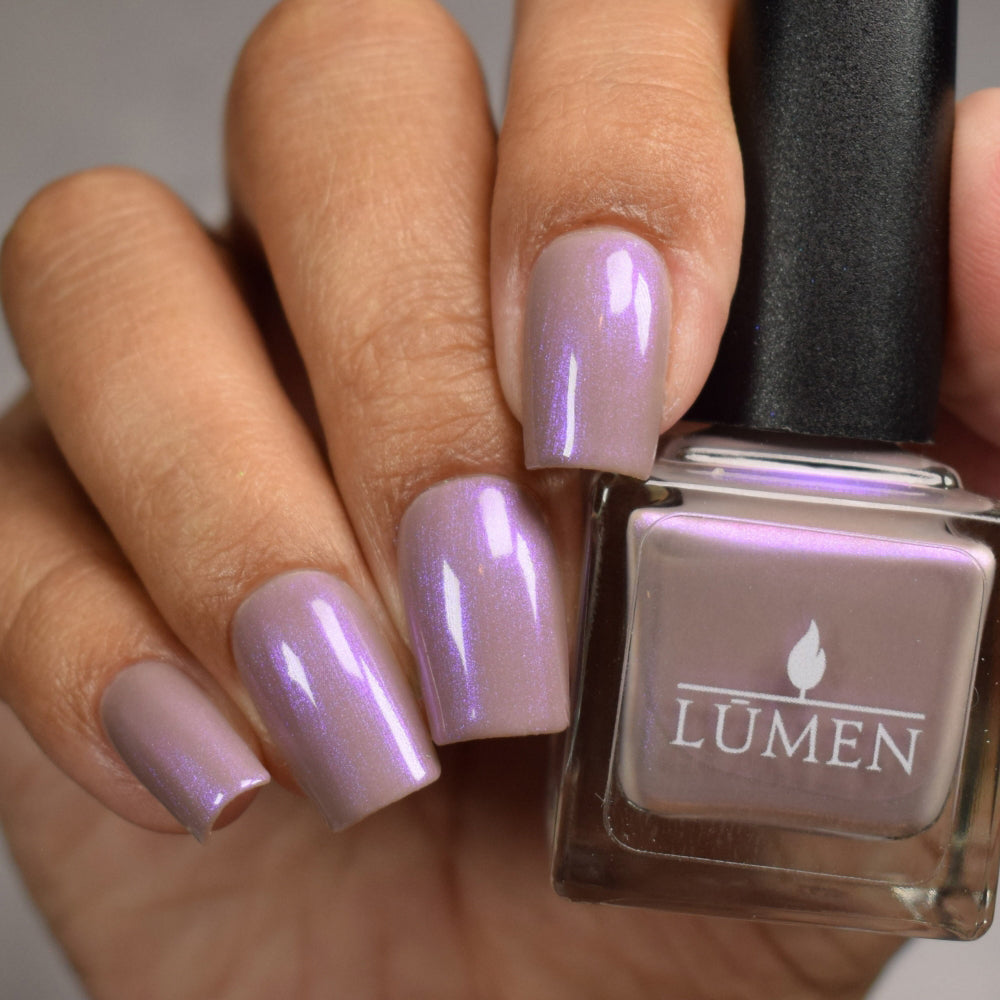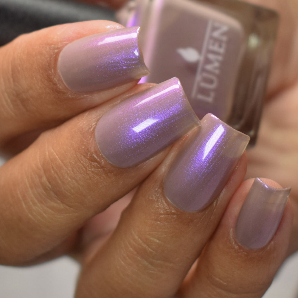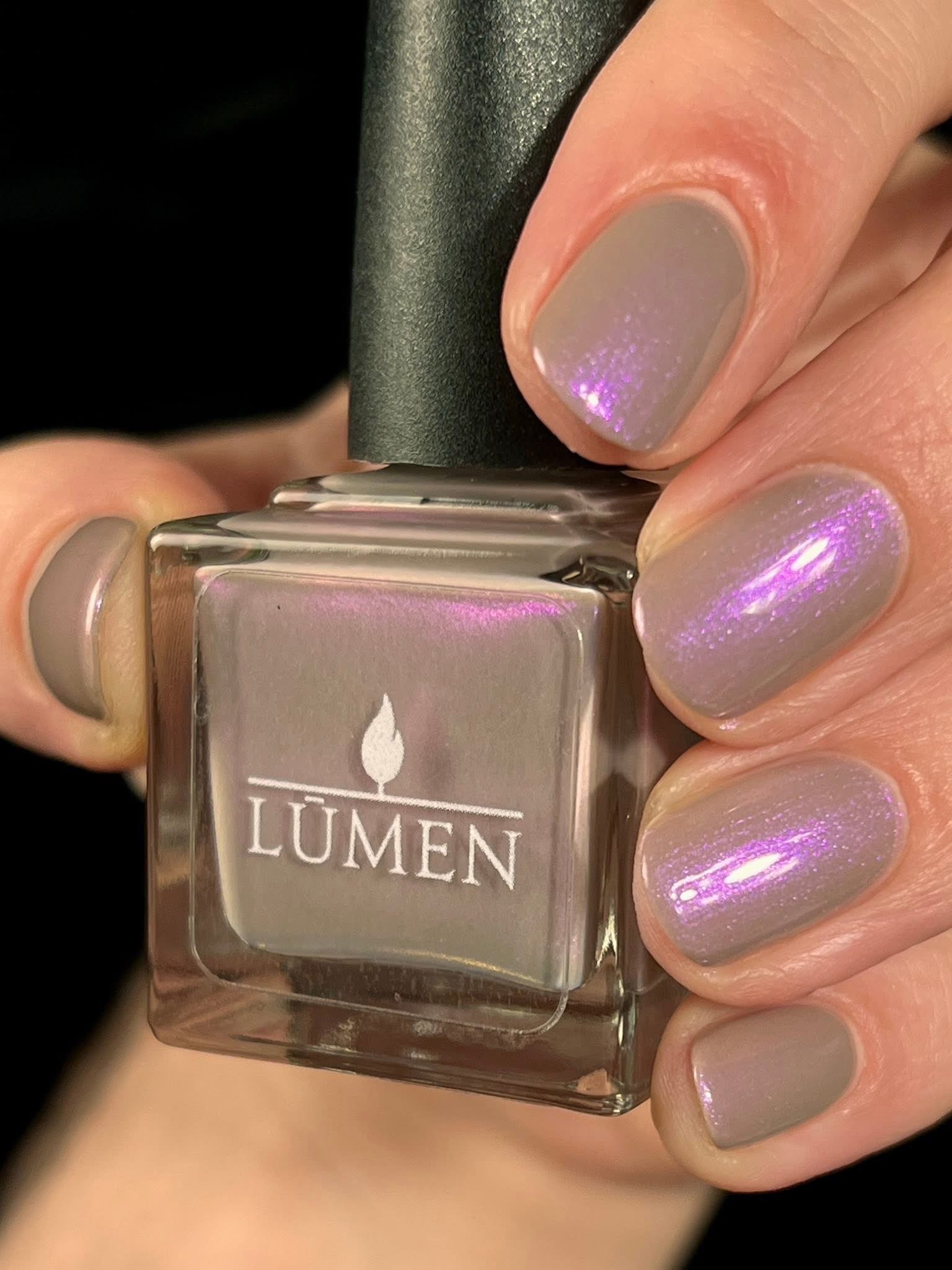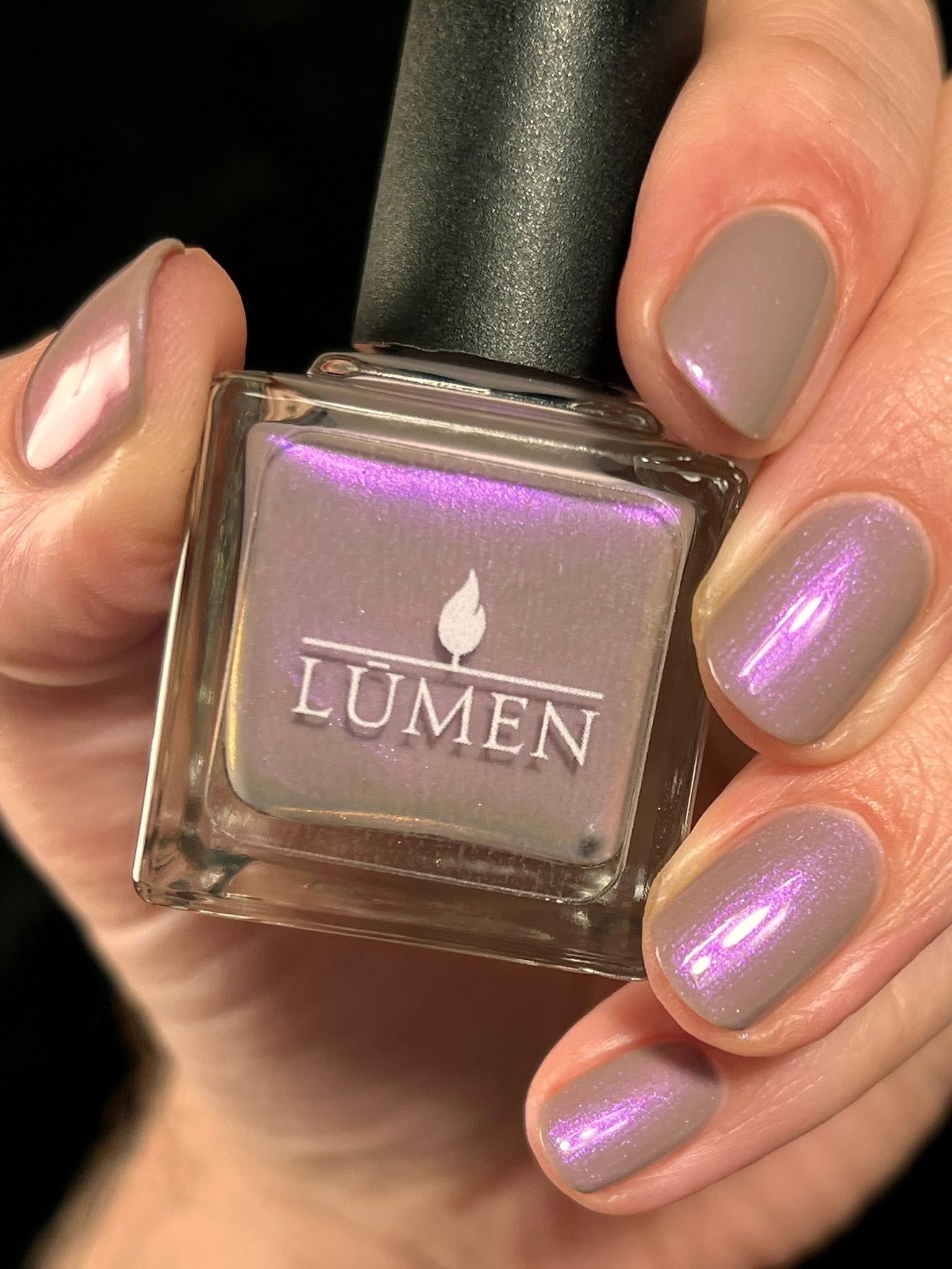 Venom & Vanilla is a smoky taupe-grey with a ghostly purple pearl shimmer. Equal parts dangerous and divine — soft with a bite