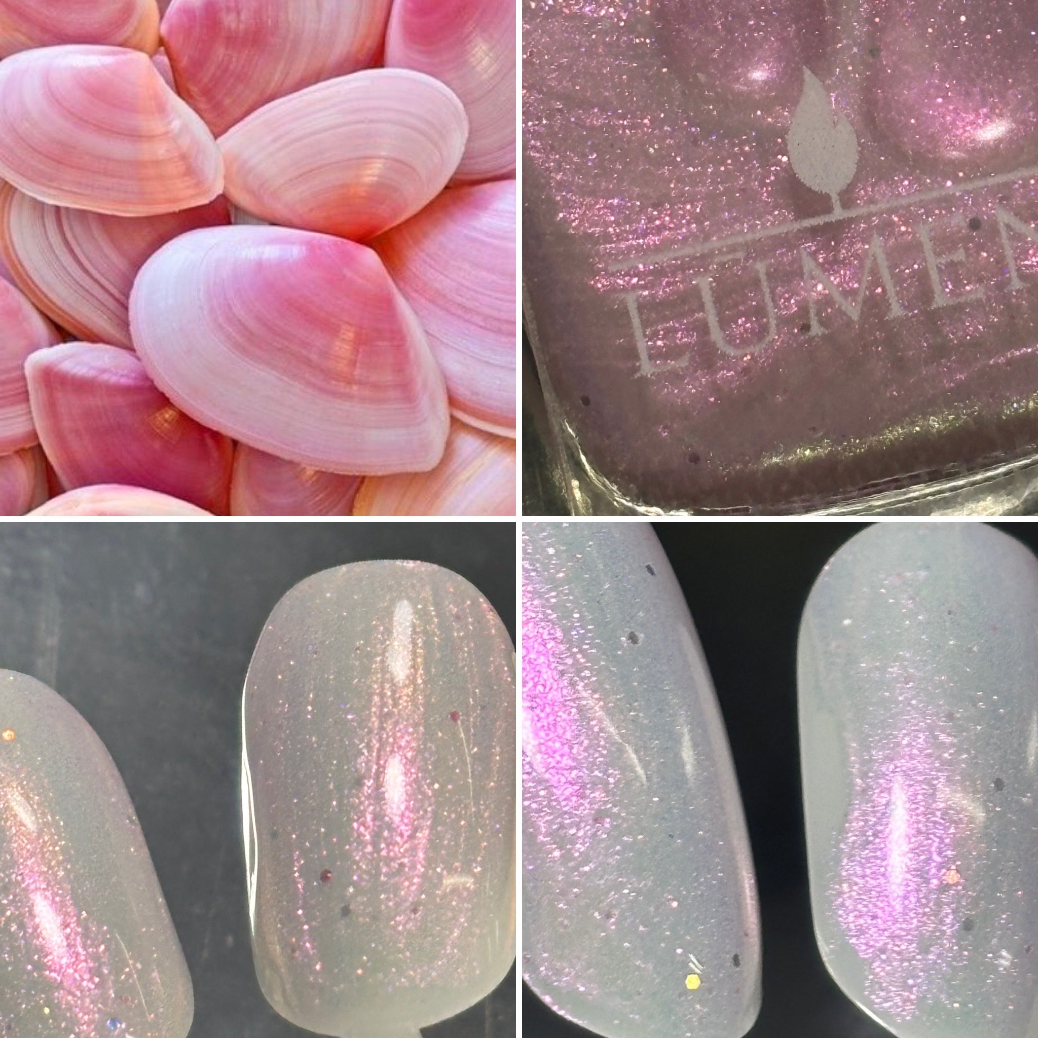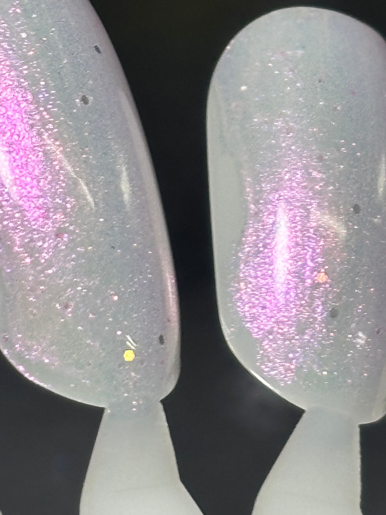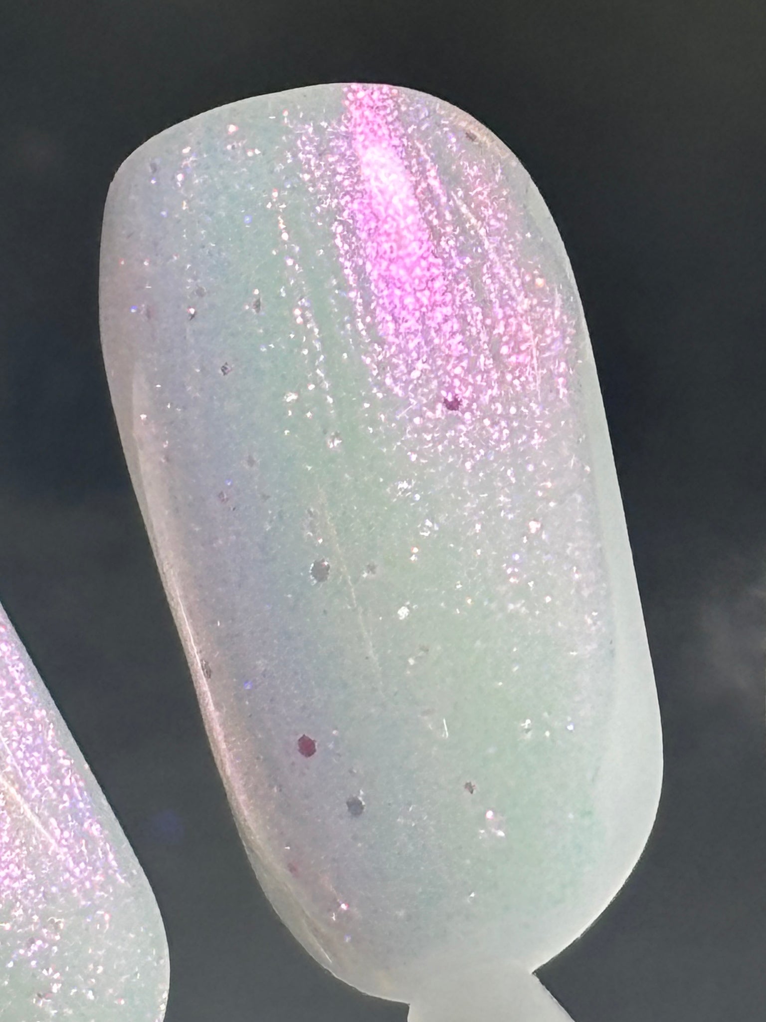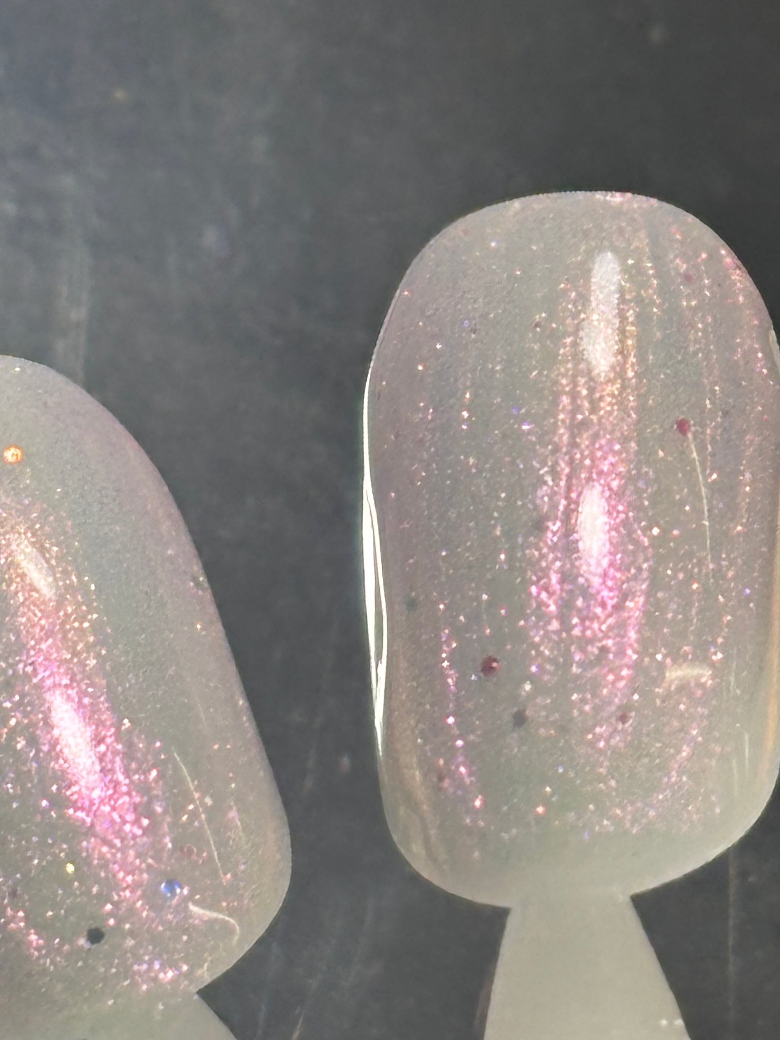 A soft pearl pink with a strong pink to purple shift with a sparse sprinkle of pink glitter. This is a limited prototype.