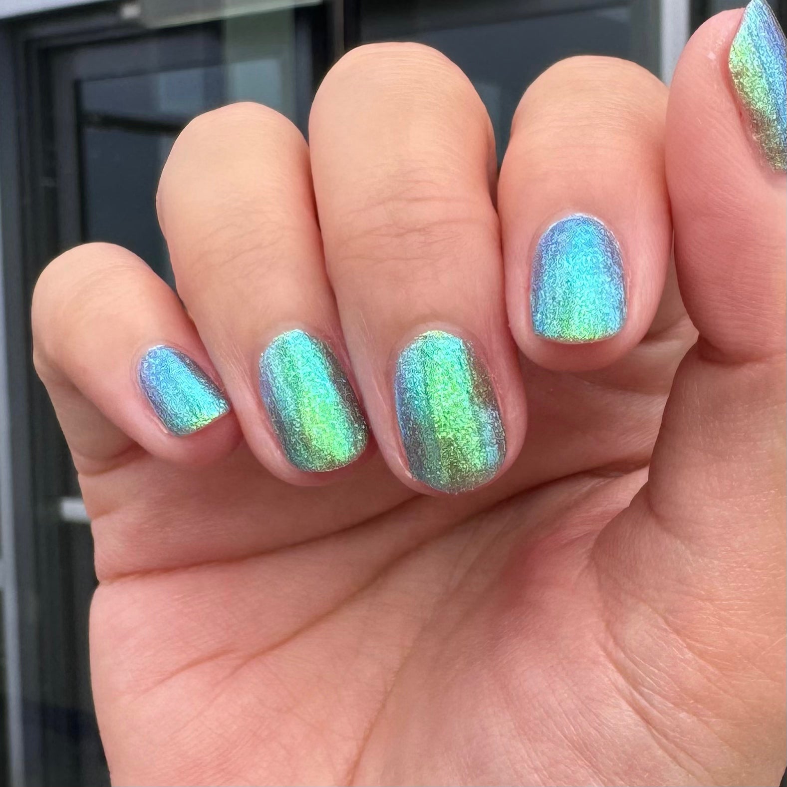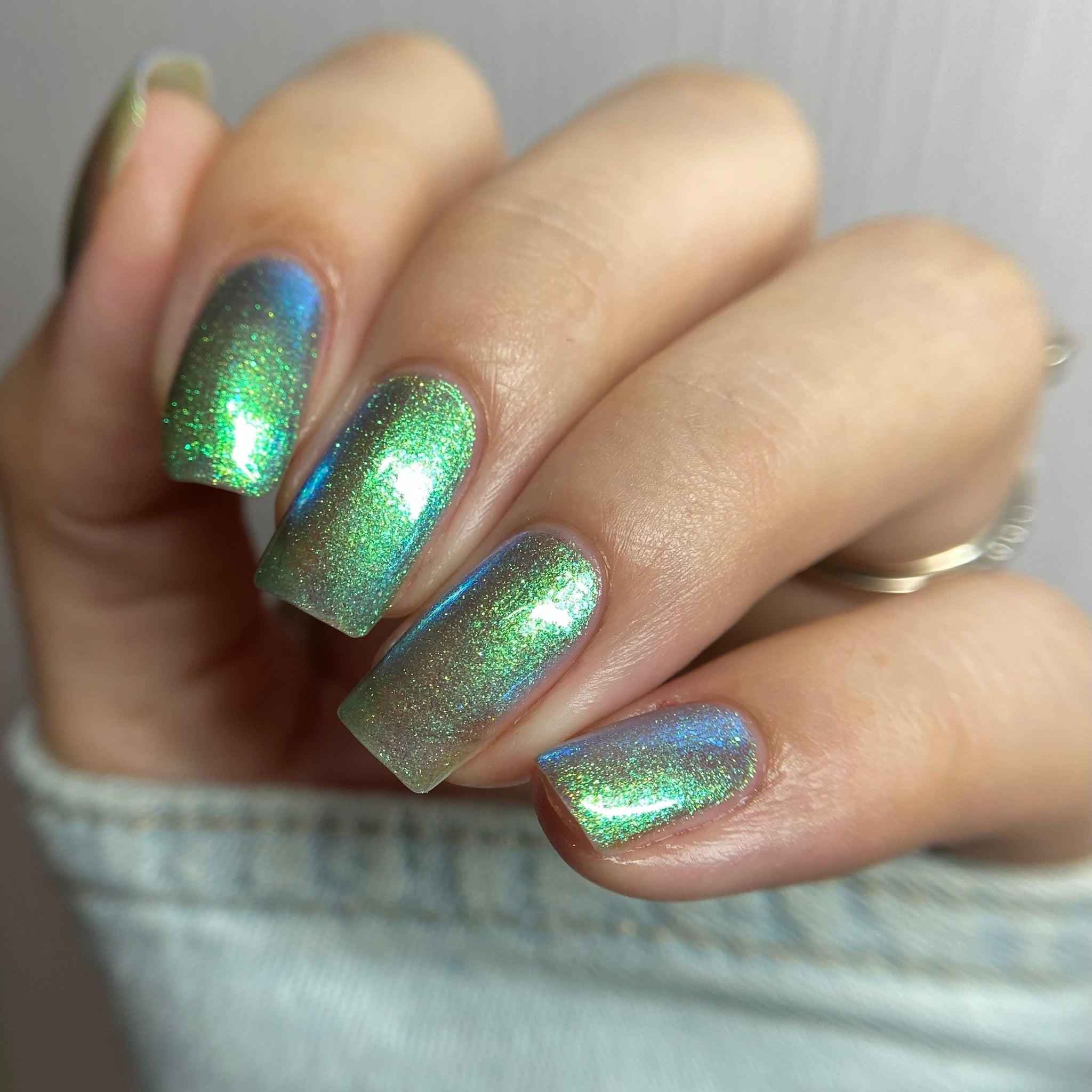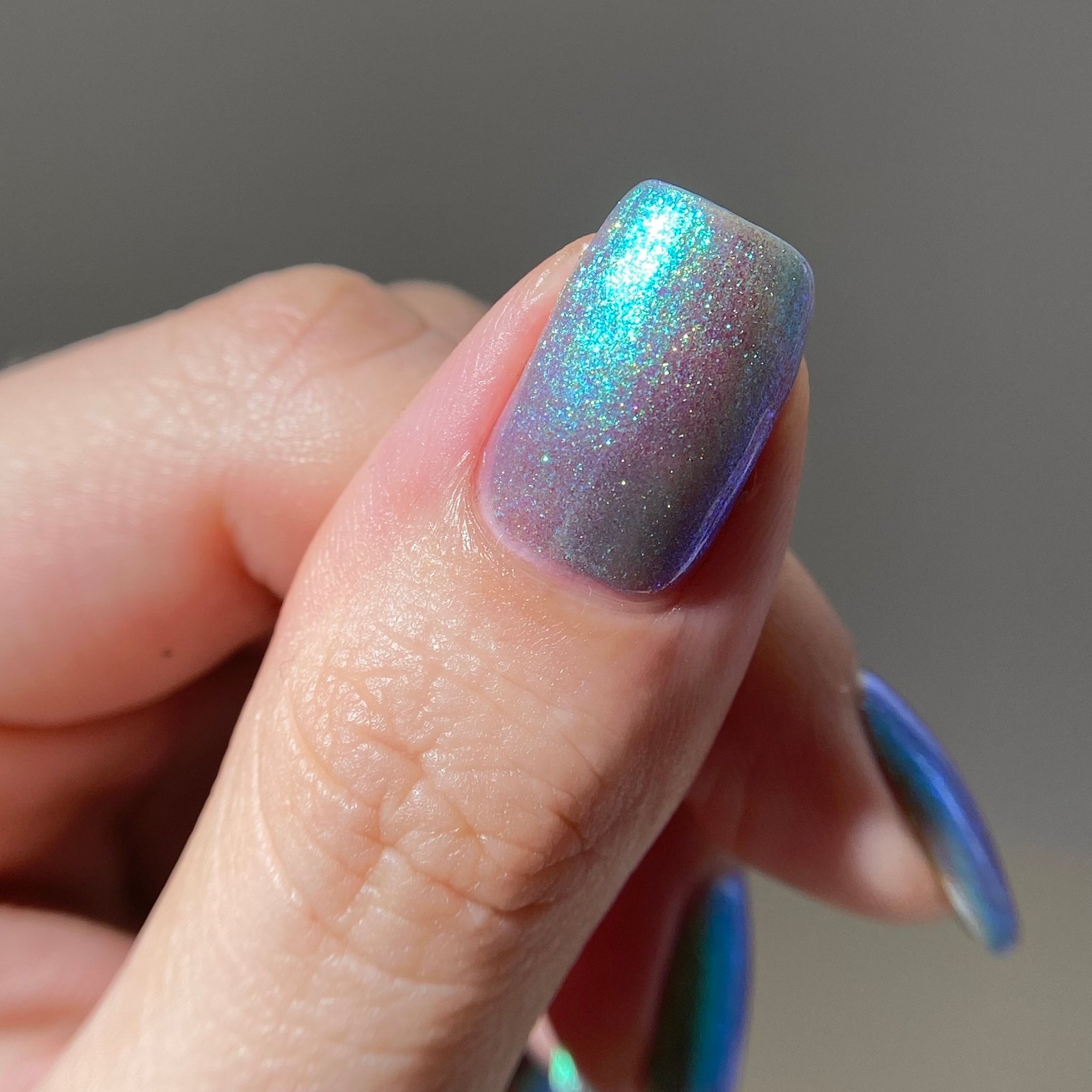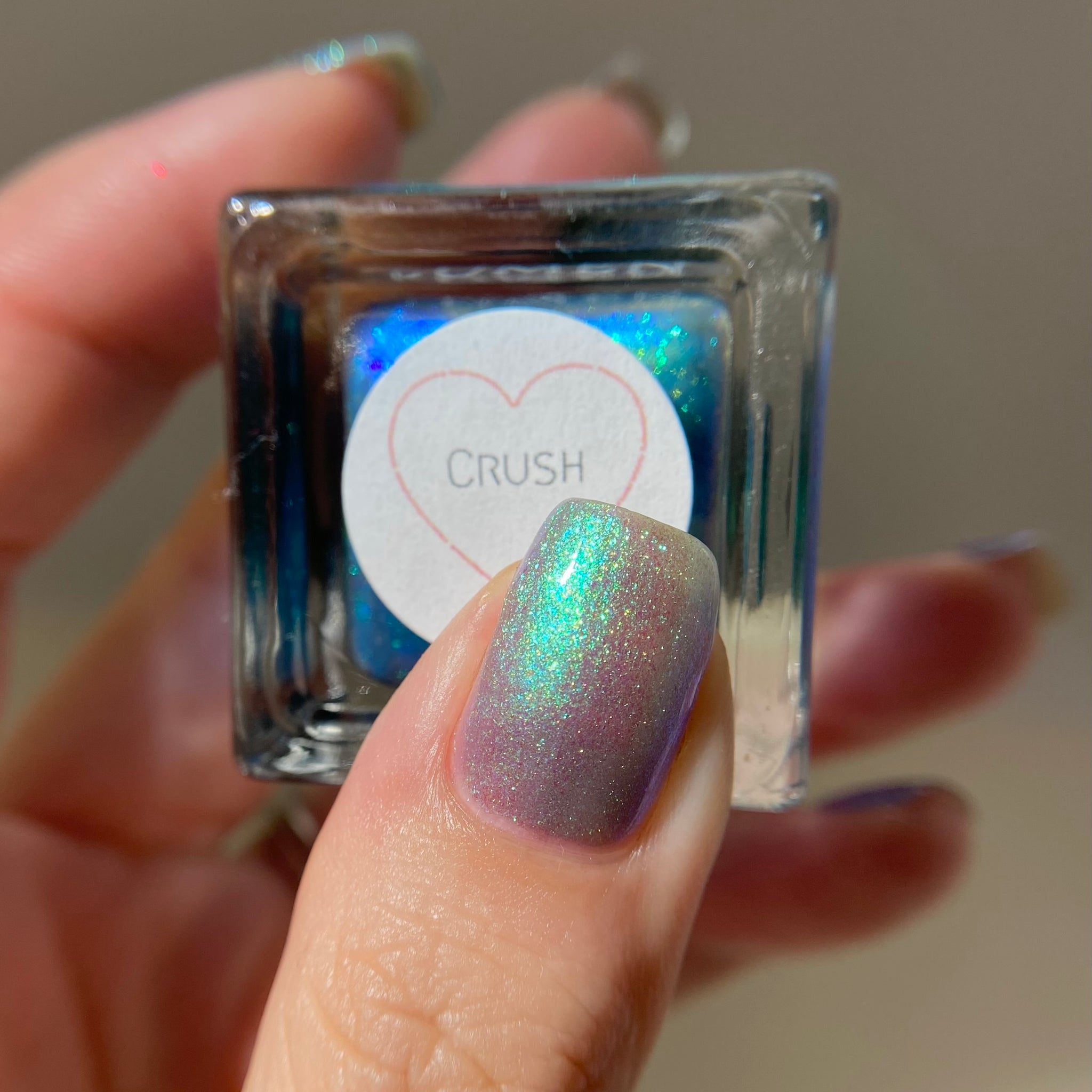 Crush is a luminous blue-to-green polish that shifts with the light.The base begins as a deep, romantic blue, blooming into rich green flashes as your nails move, creating a dimensional, modern finish that feels both mysterious and magnetic. It’s bold without being loud, nostalgic yet undeniably now—perfect for those who fall slowly but deeply.