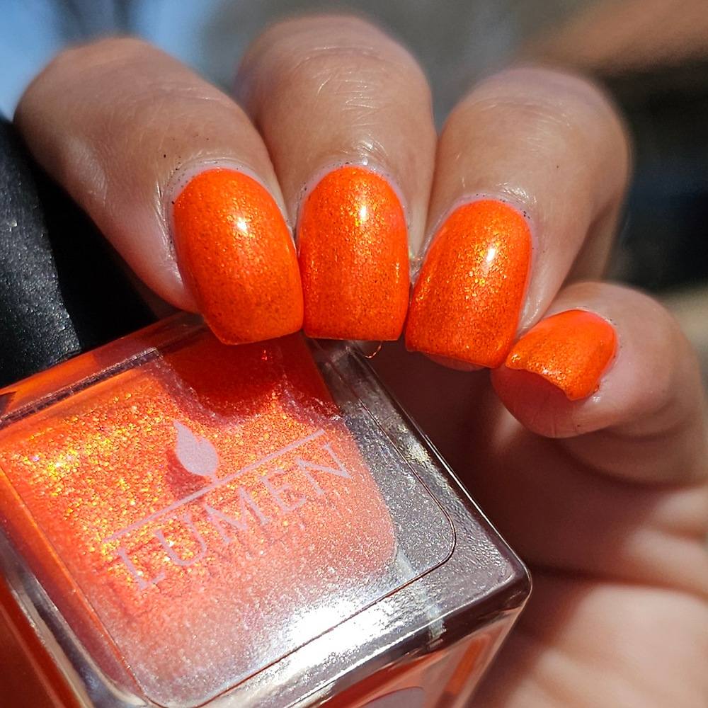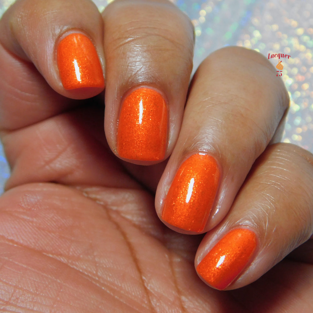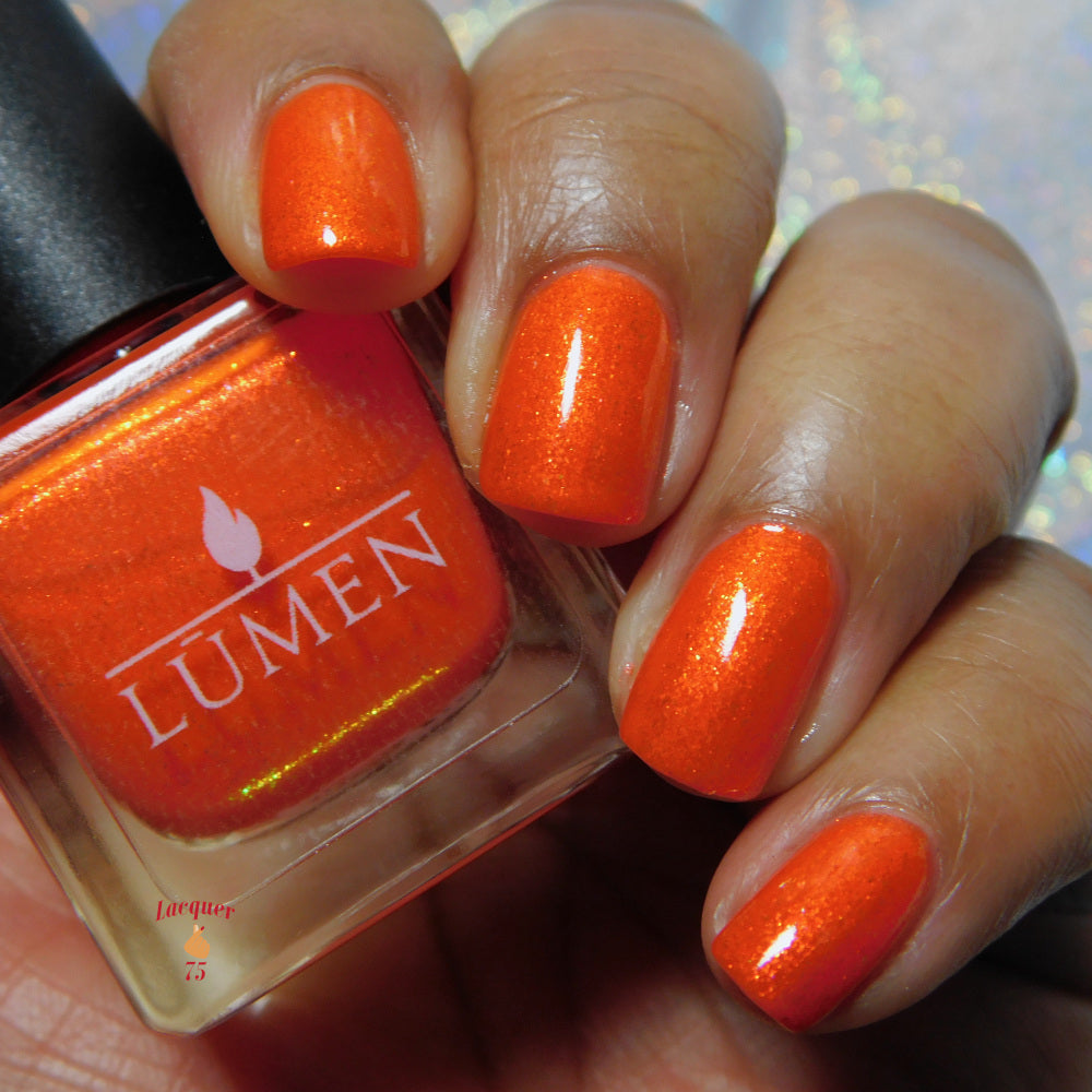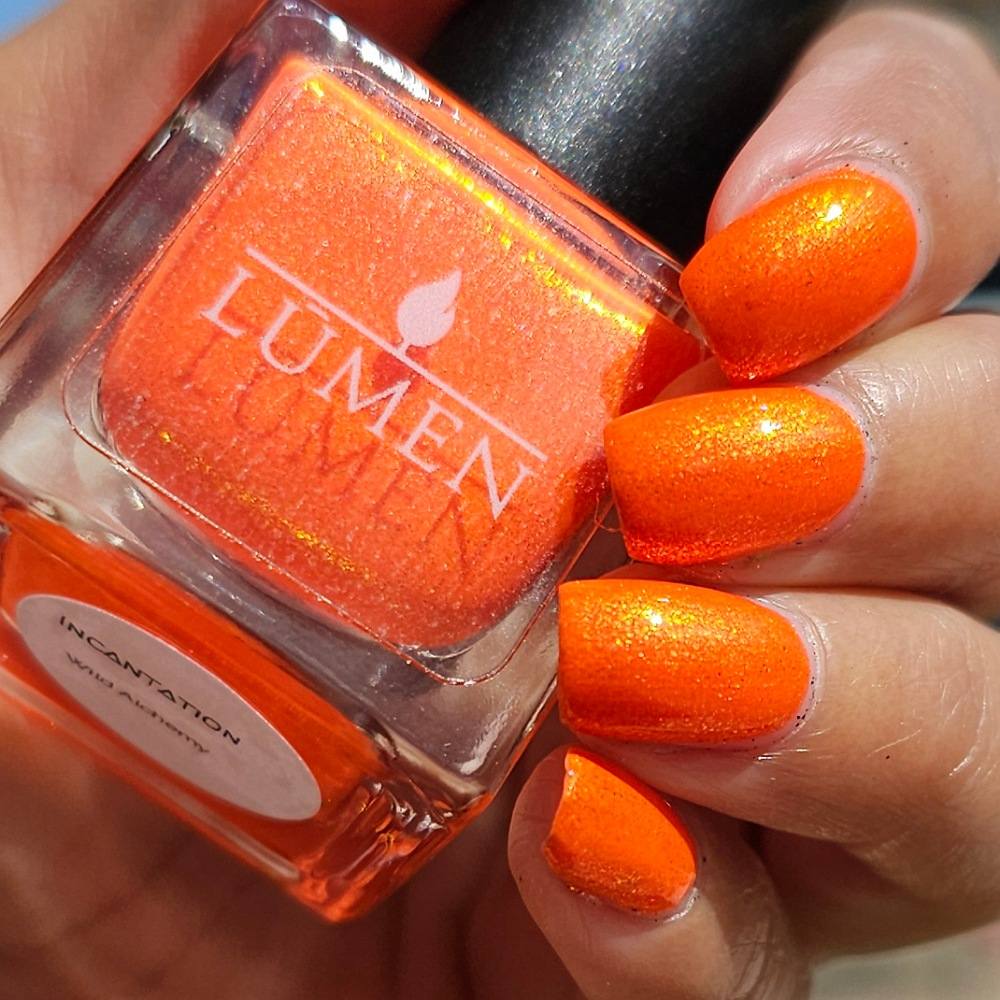 Incantation is a lively vivid orange with a small particle red to orange shift and a large particle red to orange shimmer