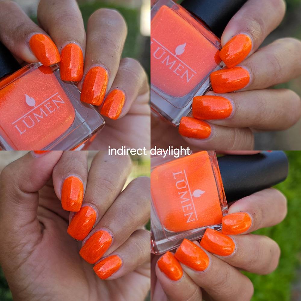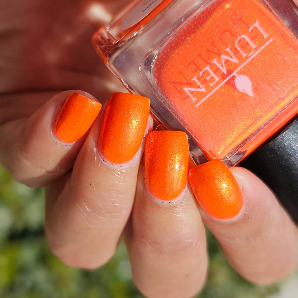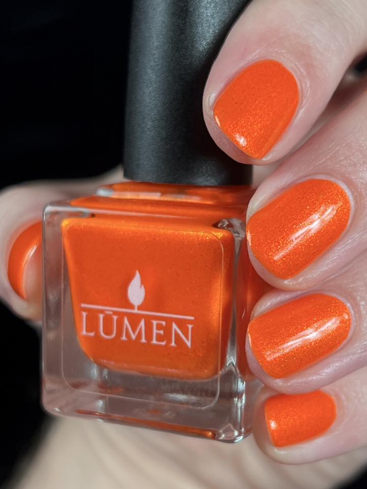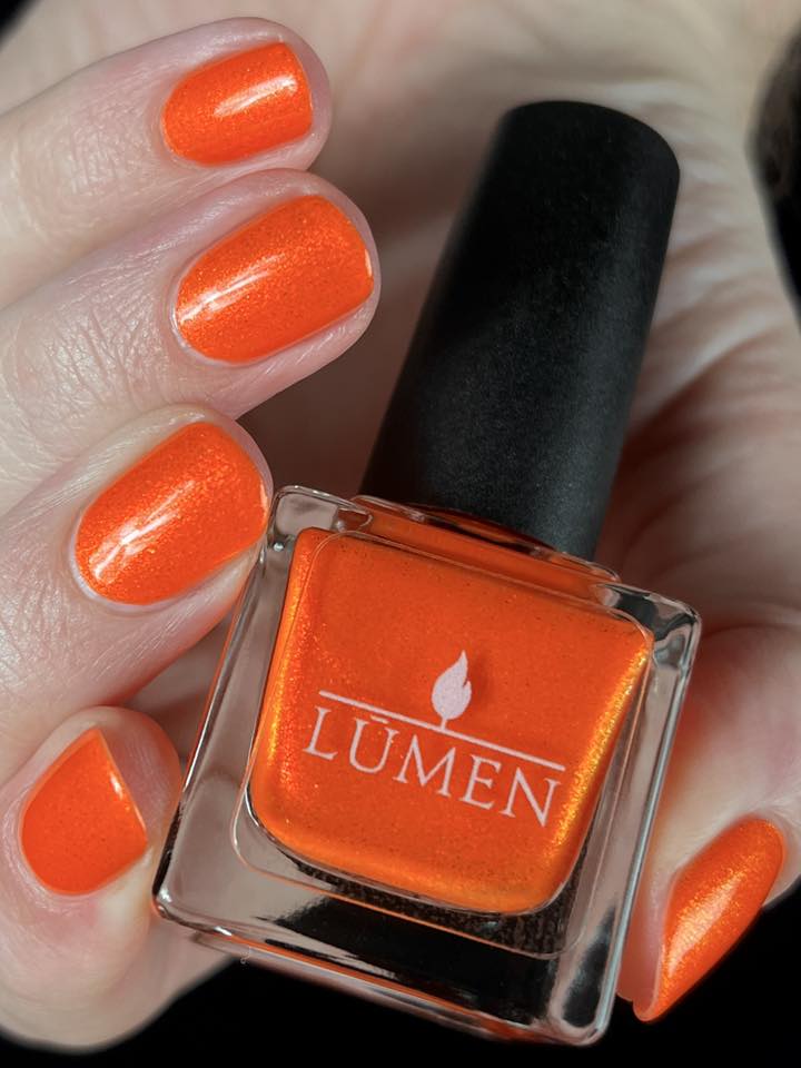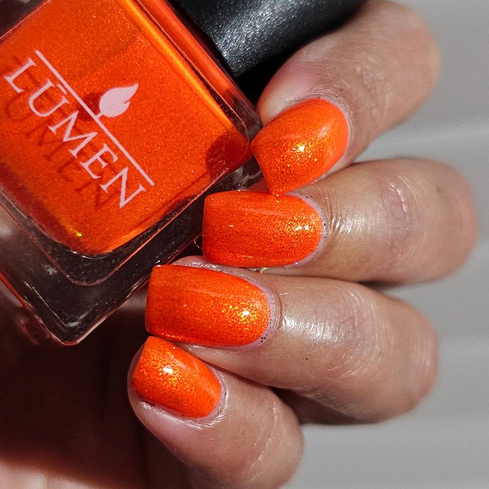 Incantation is a lively vivid orange with a small particle red to orange shift and a large particle red to orange shimmer