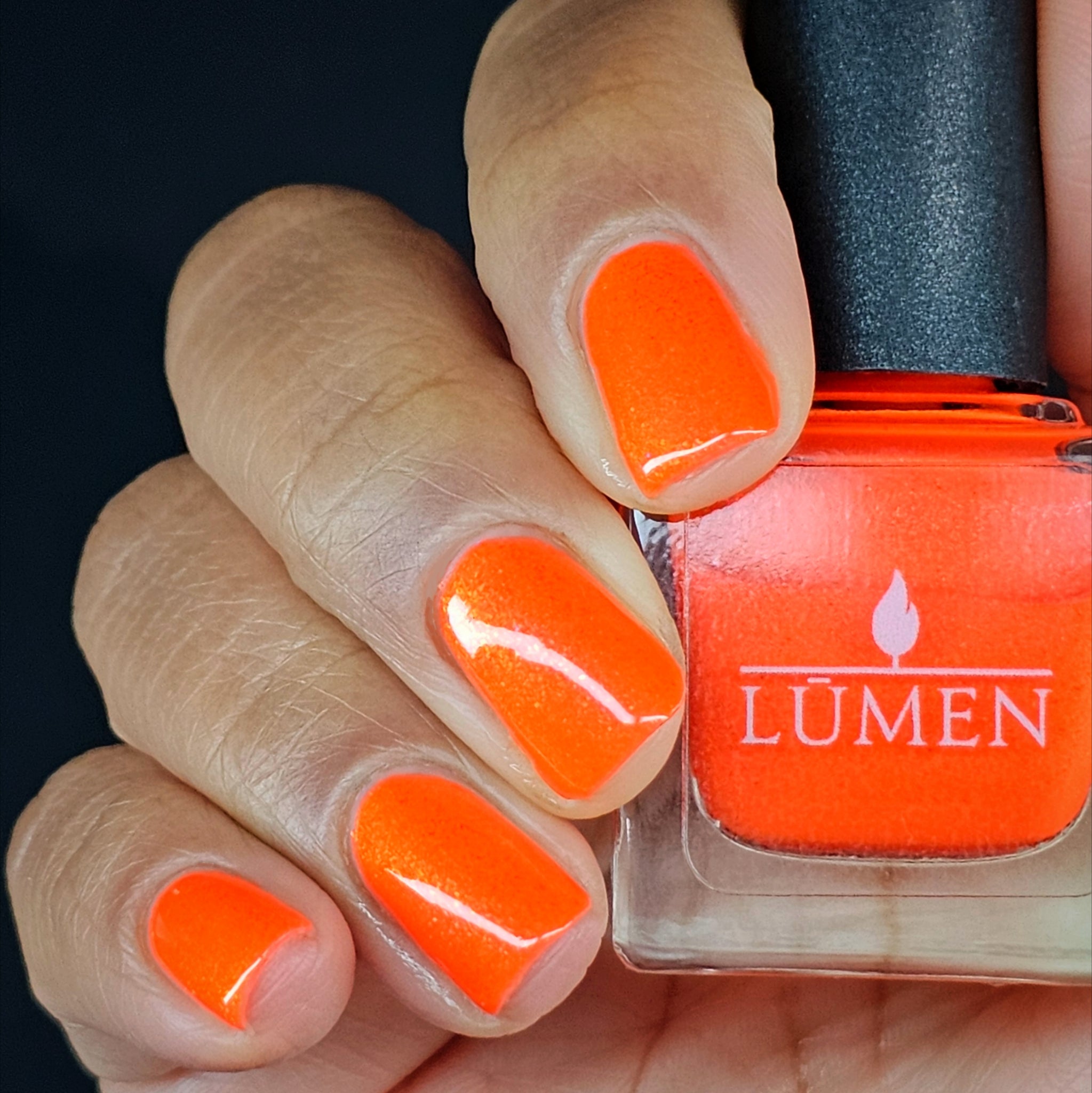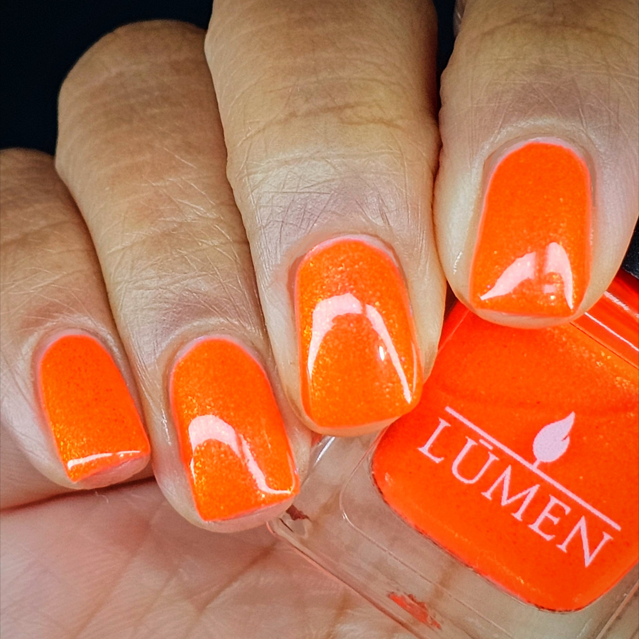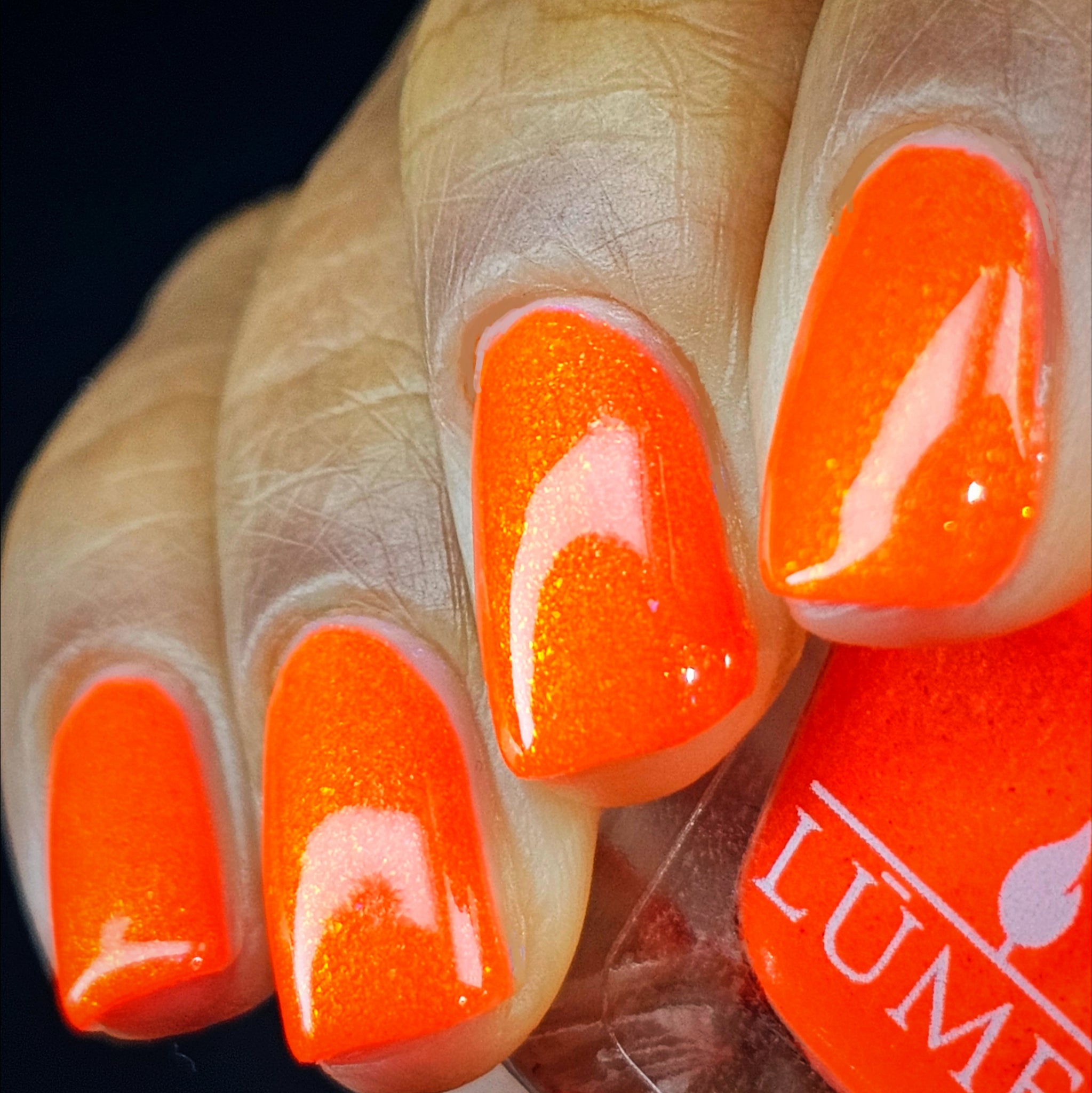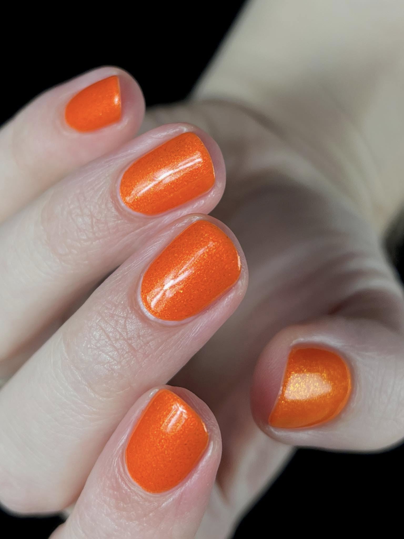 Incantation is a lively vivid orange with a small particle red to orange shift and a large particle red to orange shimmer