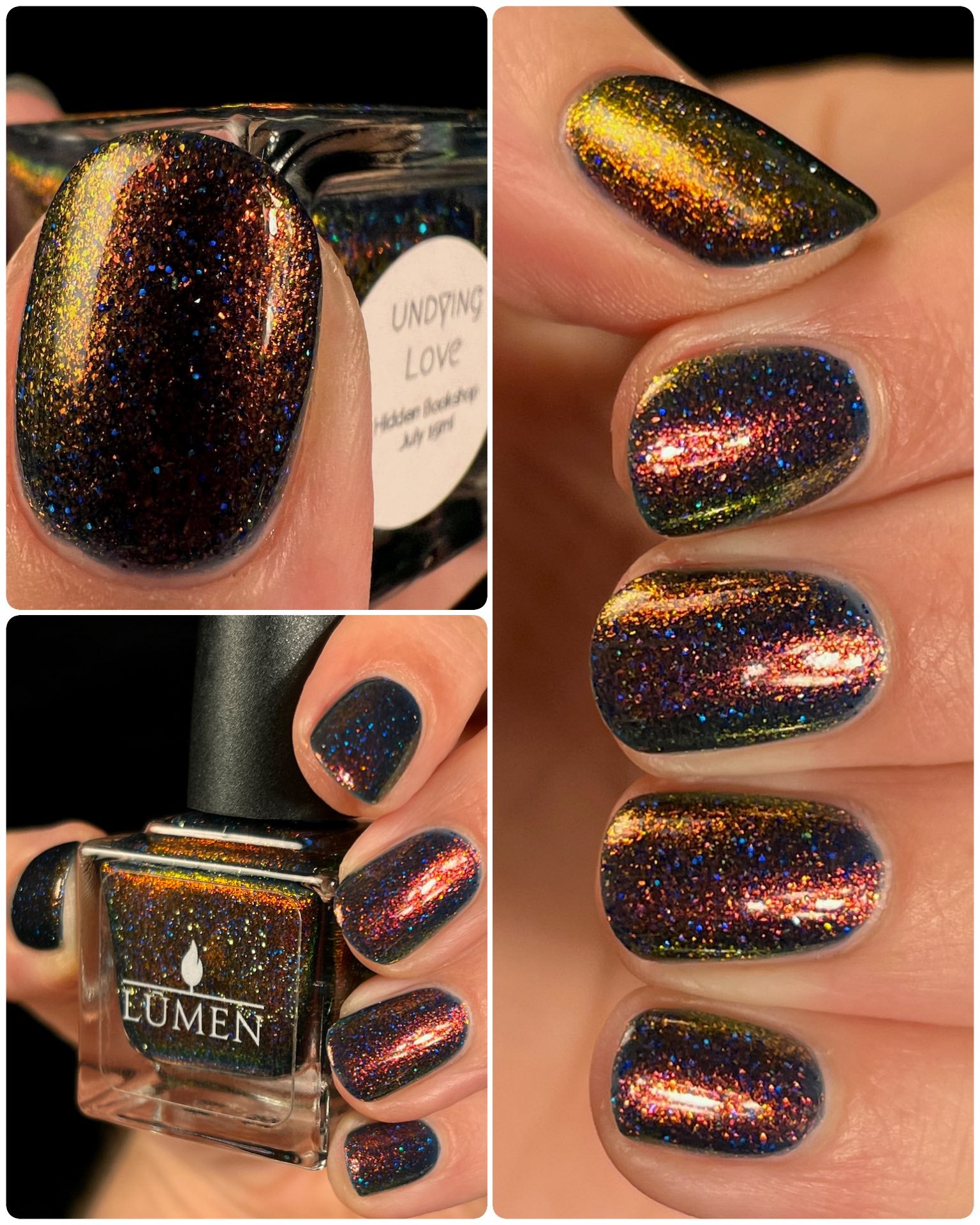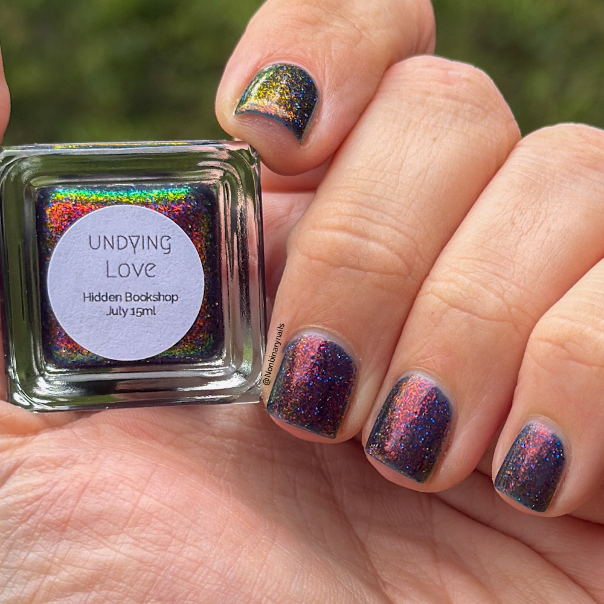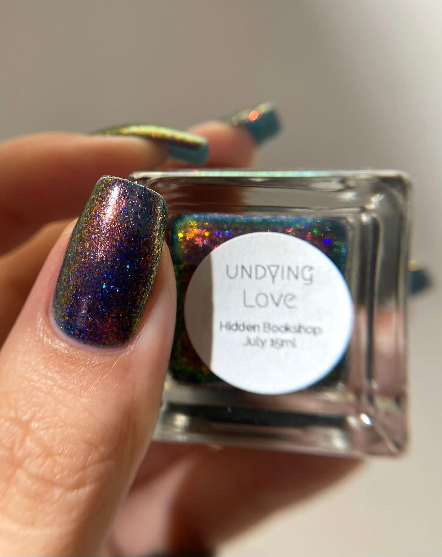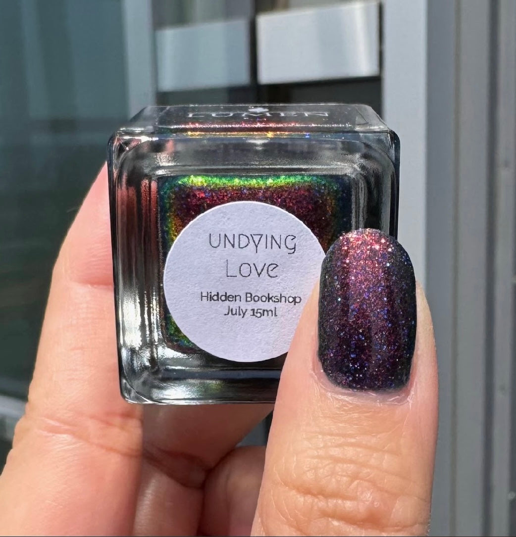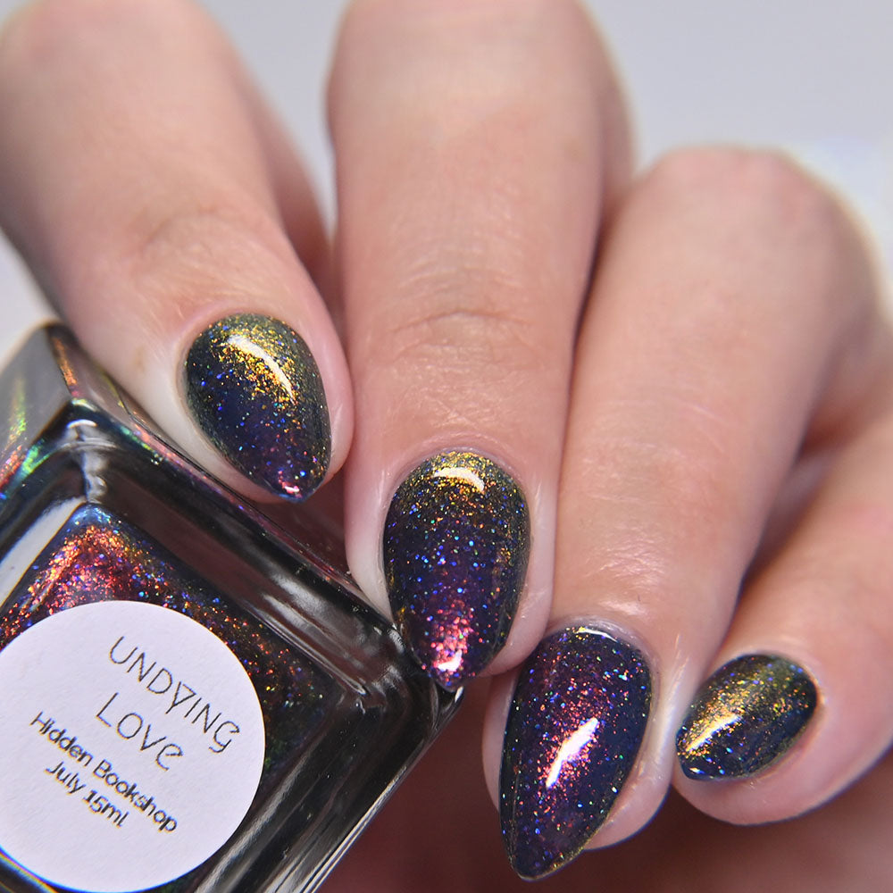 Undying love is our hidden bookshop polish for the month of July inspired by every Vampire love story because its too hard to pick only one! A blackened blue base saturated with a red to orange to purple shift, gold reflective and a scattered blue holo, this is a truly unique shade made for those who desire immortal love.