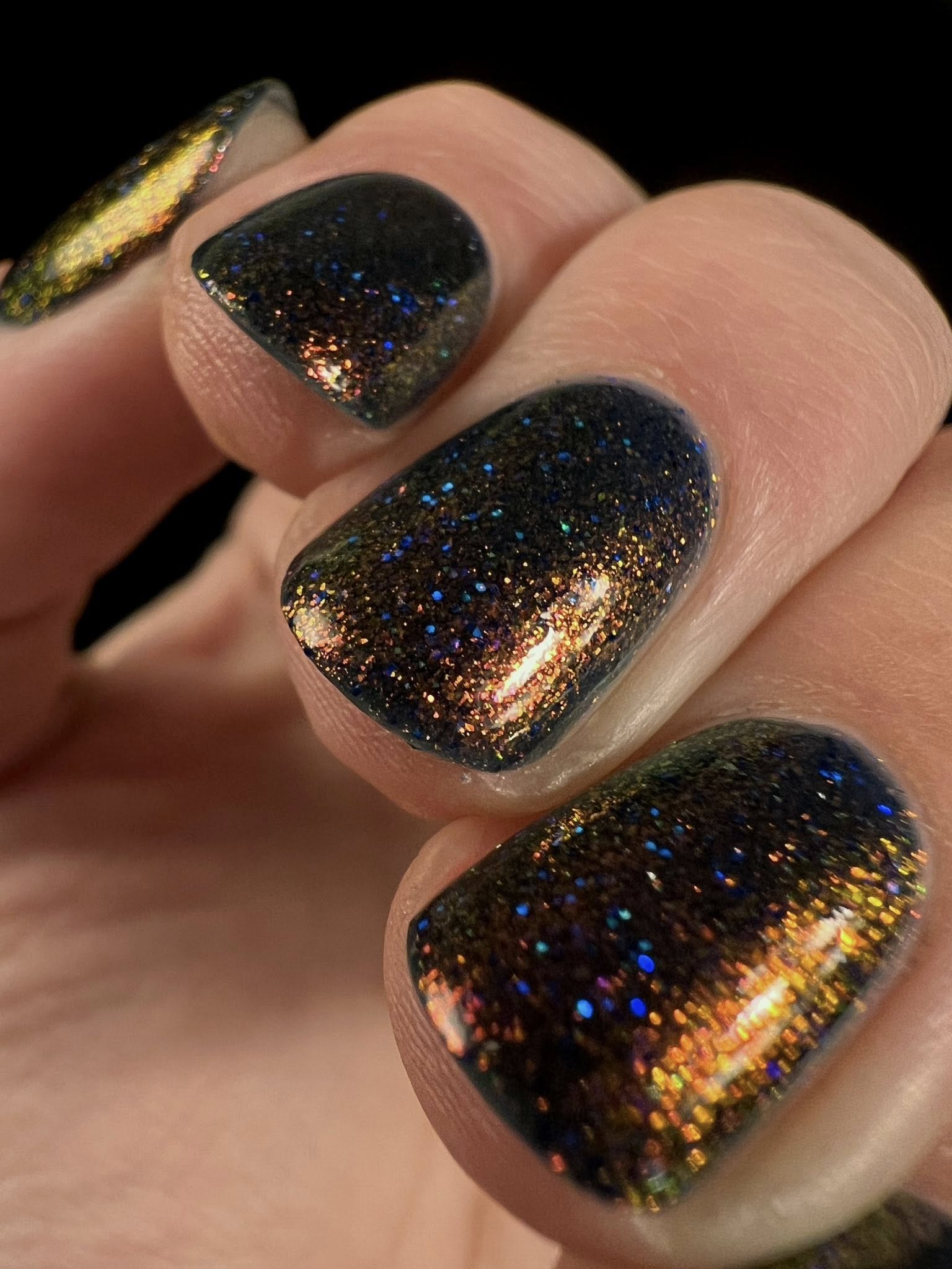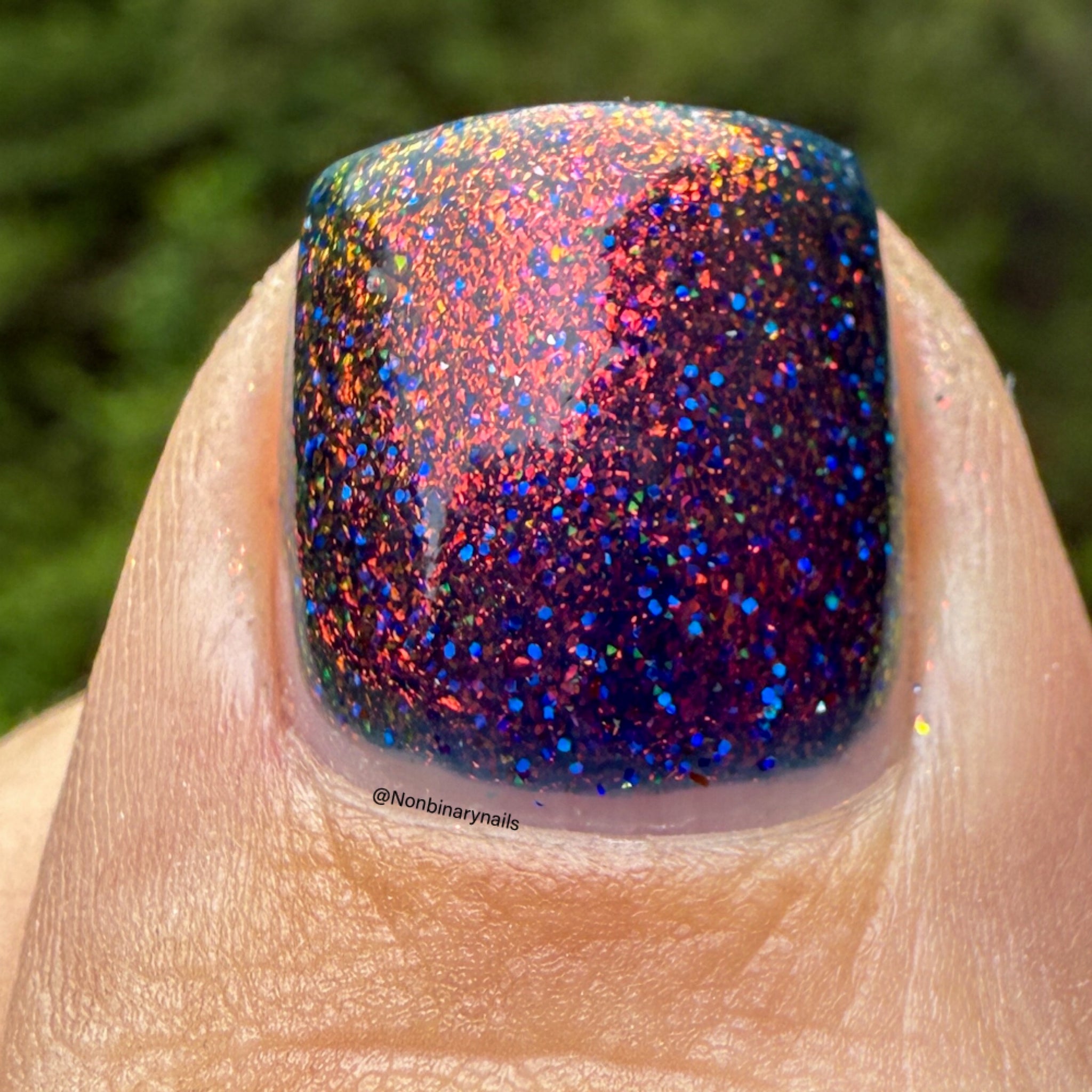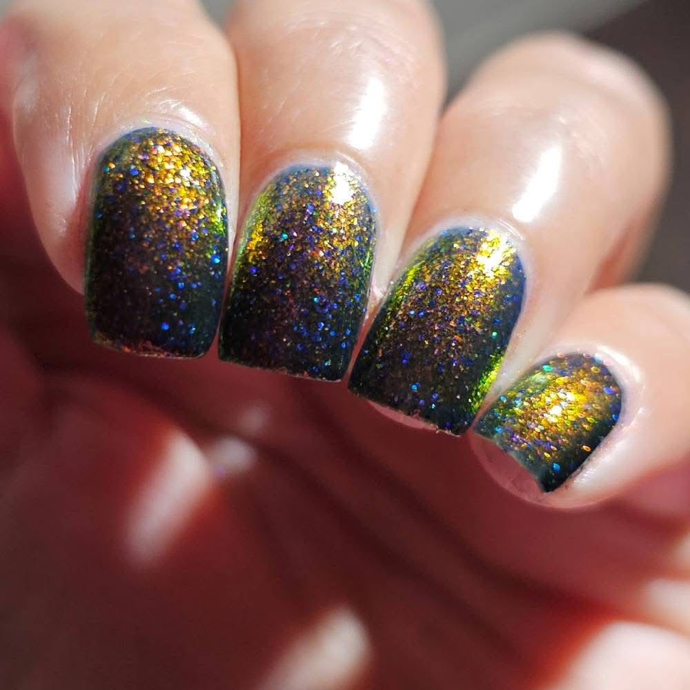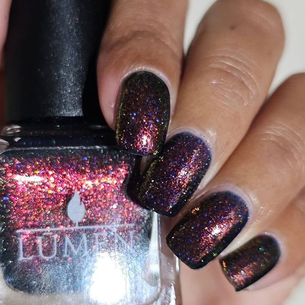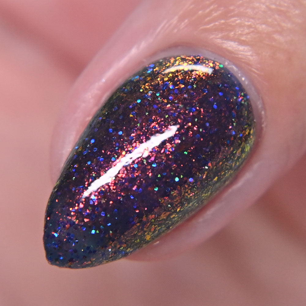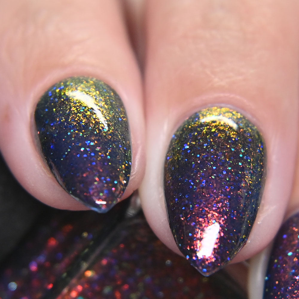 Undying love is our hidden bookshop polish for the month of July inspired by every Vampire love story because its too hard to pick only one! A blackened blue base saturated with a red to orange to purple shift, gold reflective and a scattered blue holo, this is a truly unique shade made for those who desire immortal love.
