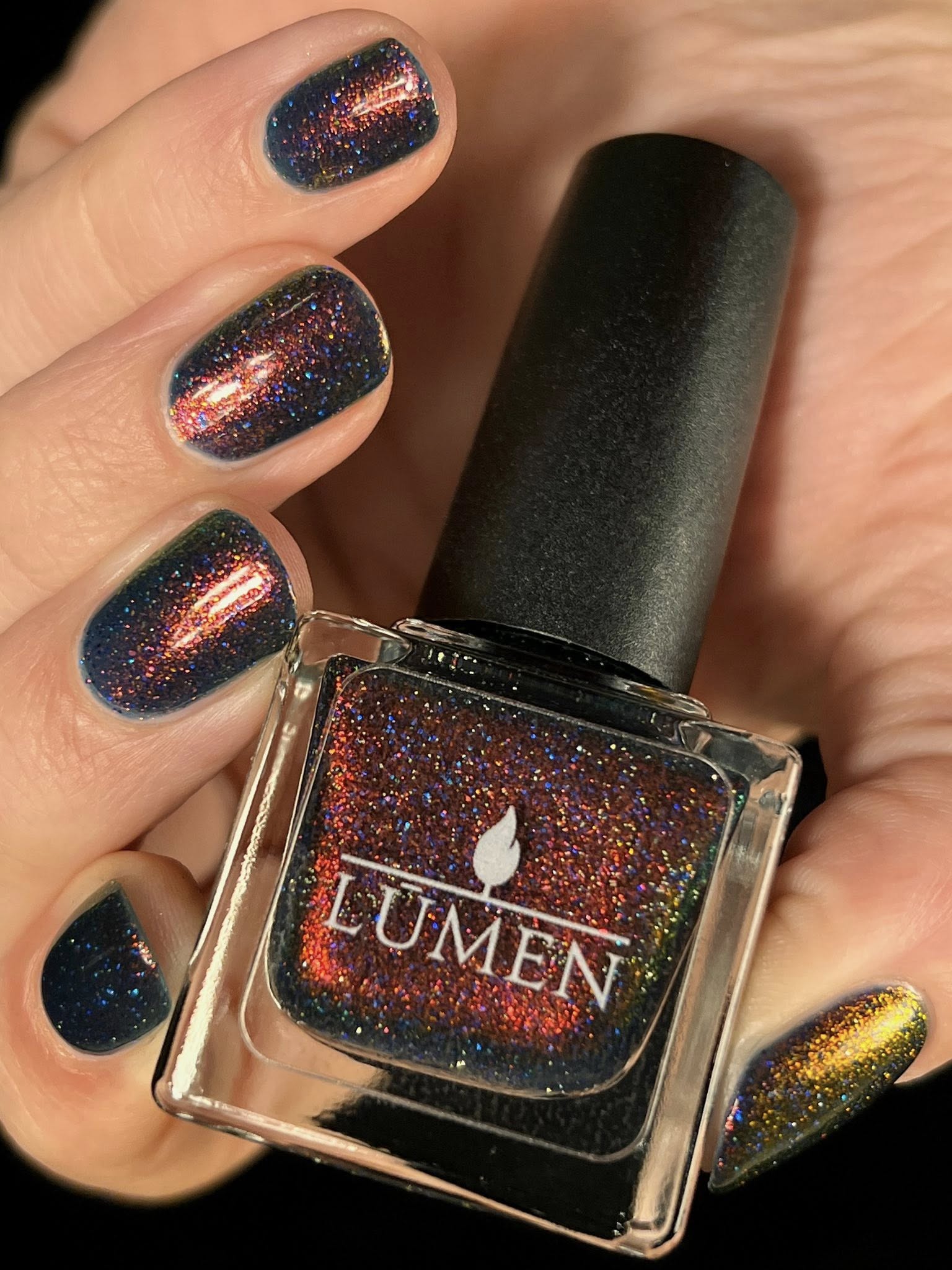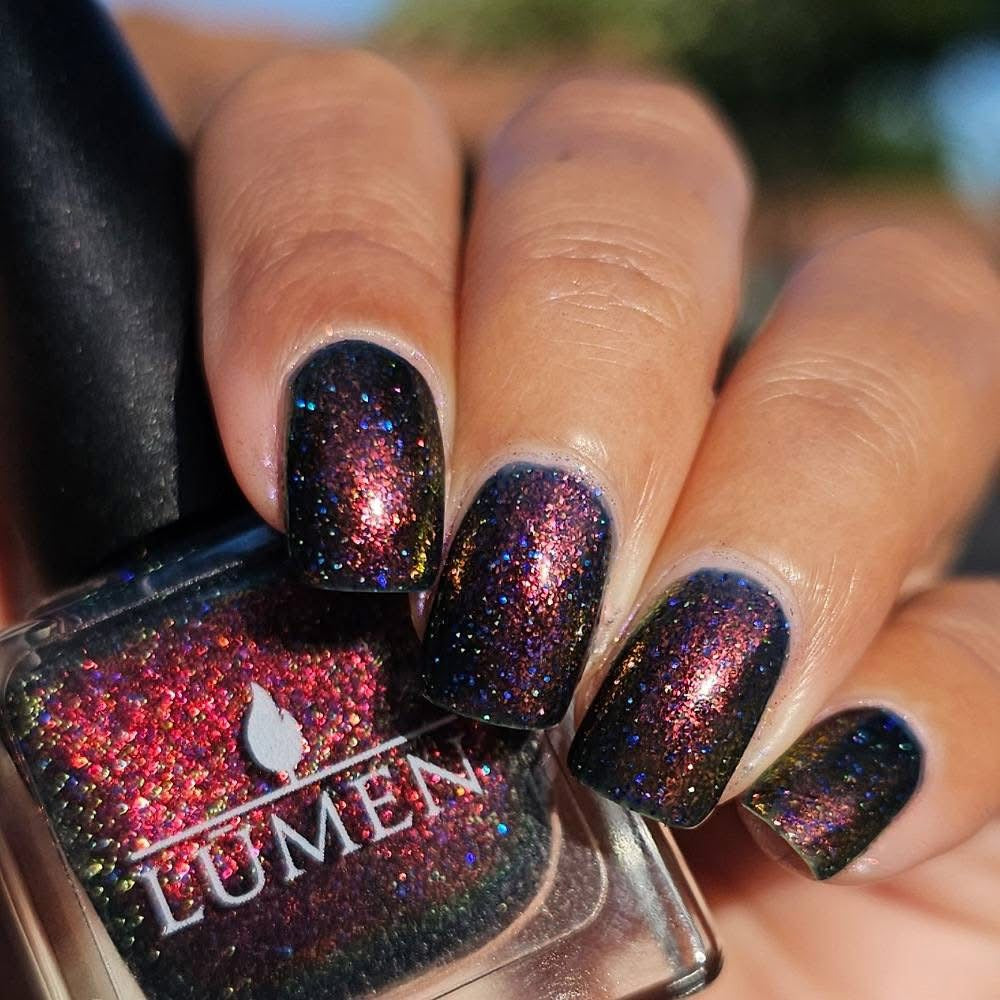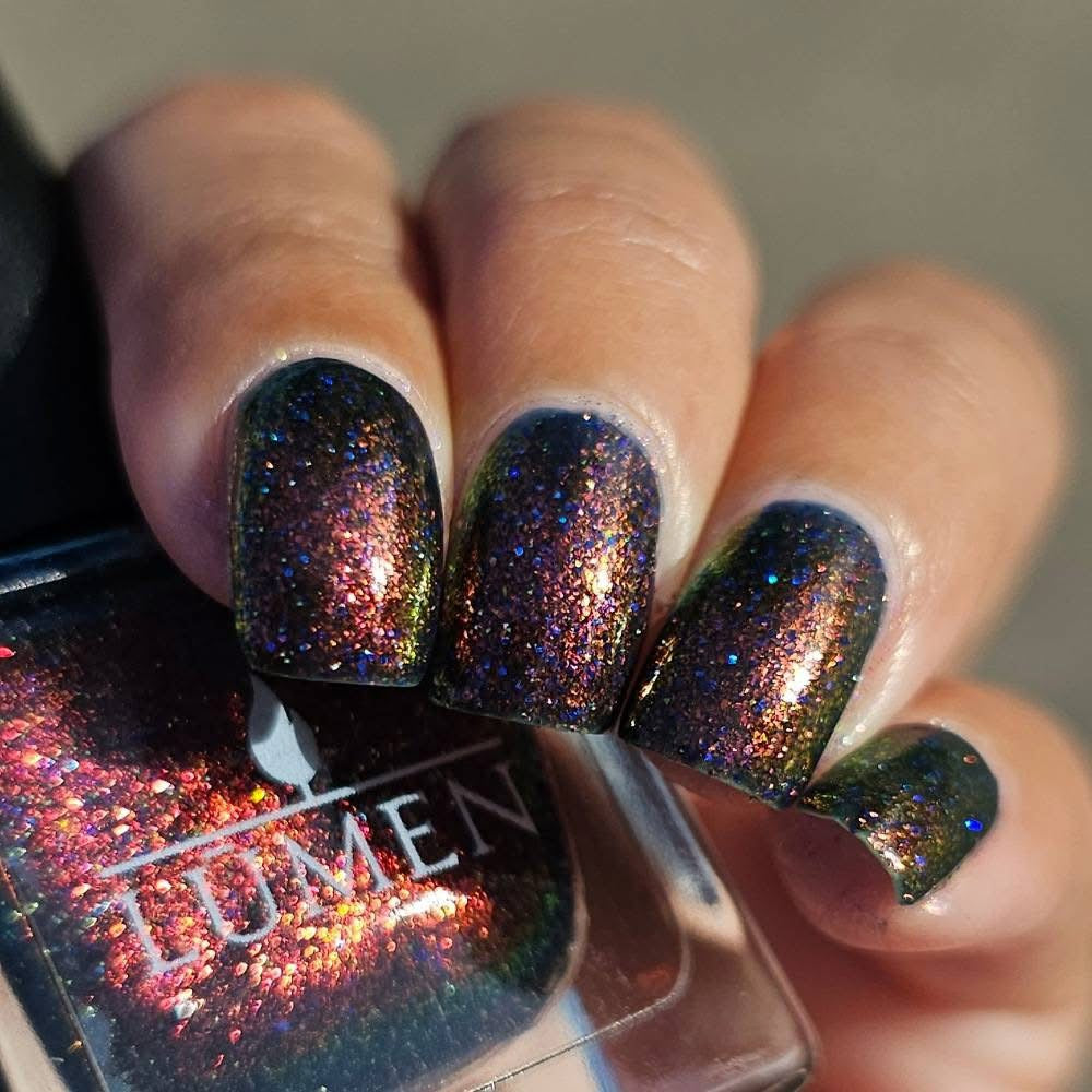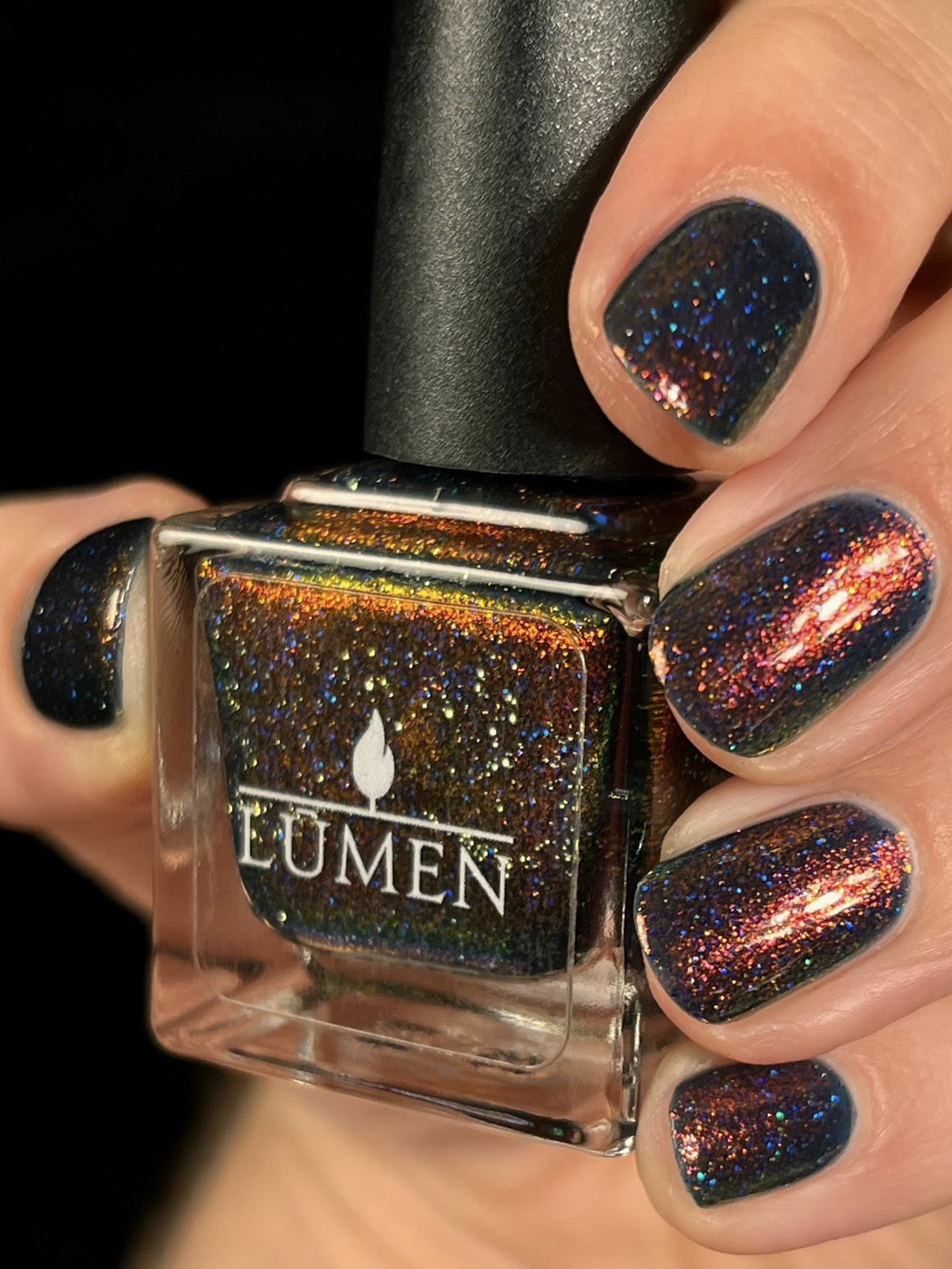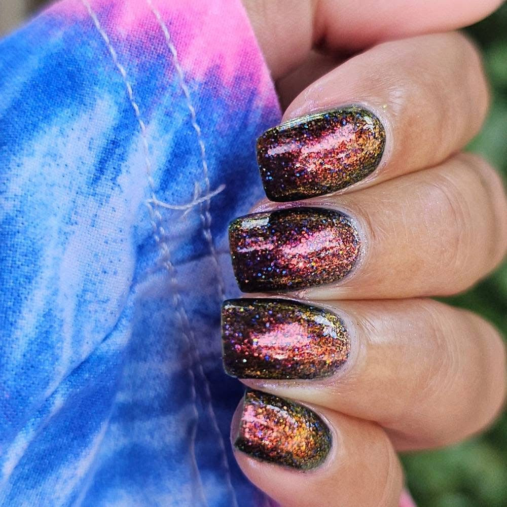 Undying love is our hidden bookshop polish for the month of July inspired by every Vampire love story because its too hard to pick only one! A blackened blue base saturated with a red to orange to purple shift, gold reflective and a scattered blue holo, this is a truly unique shade made for those who desire immortal love.