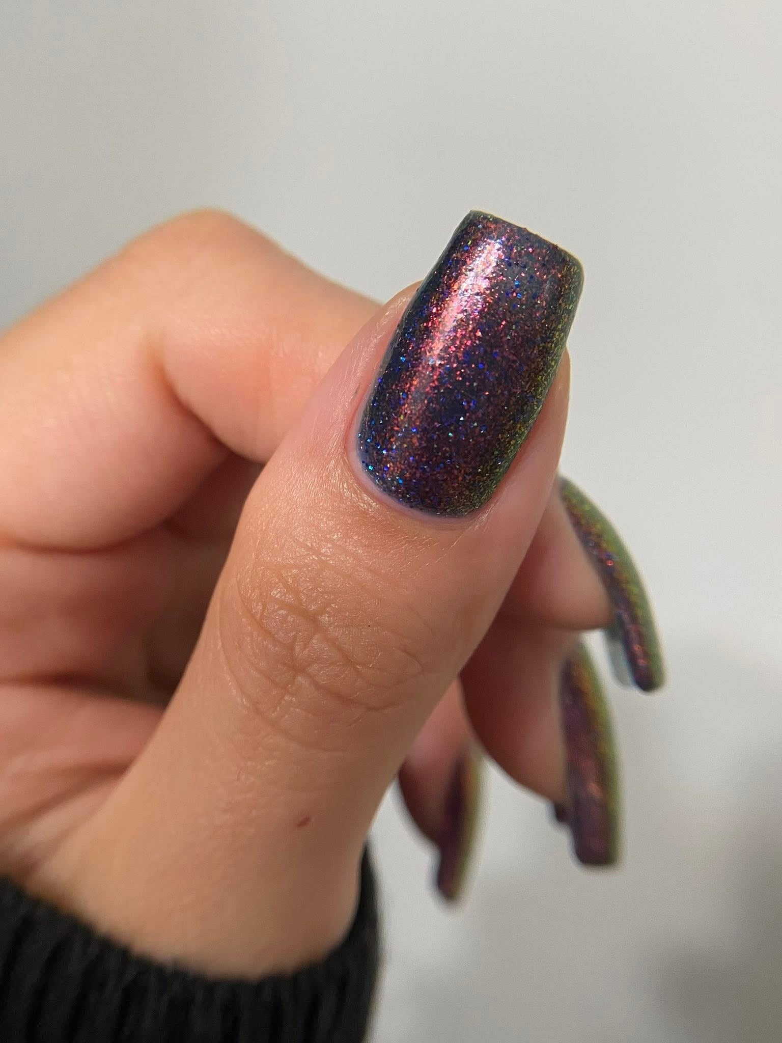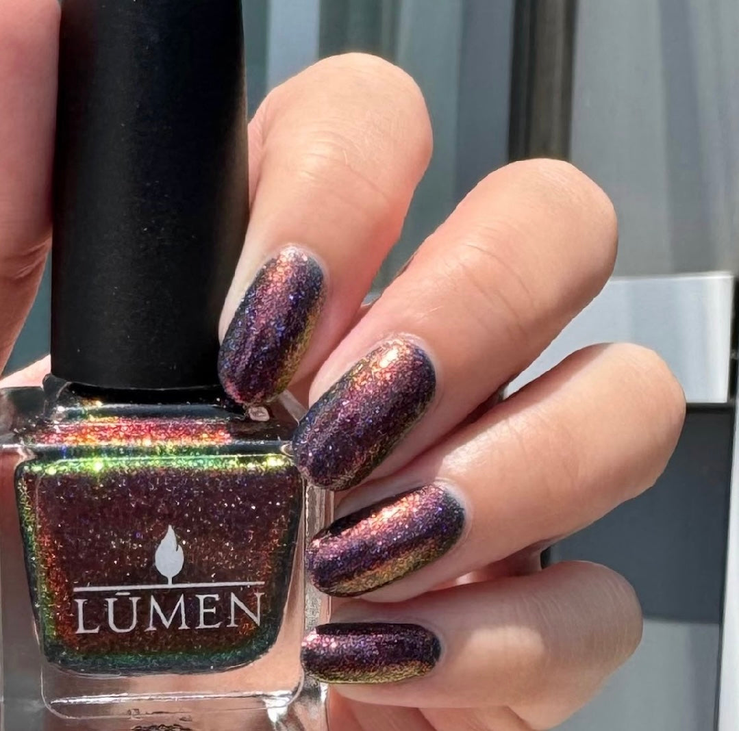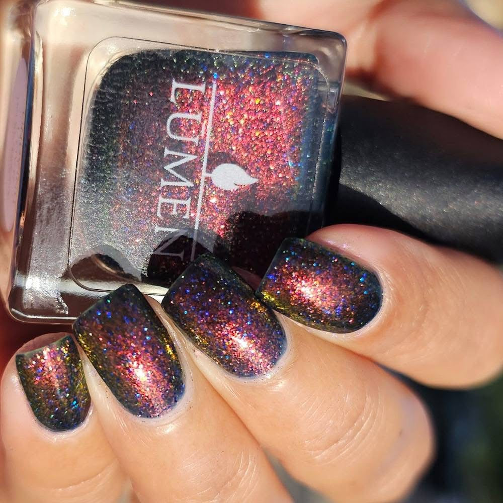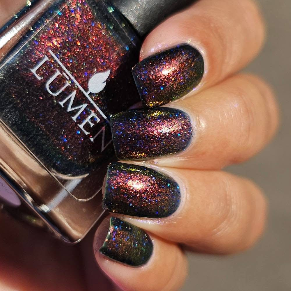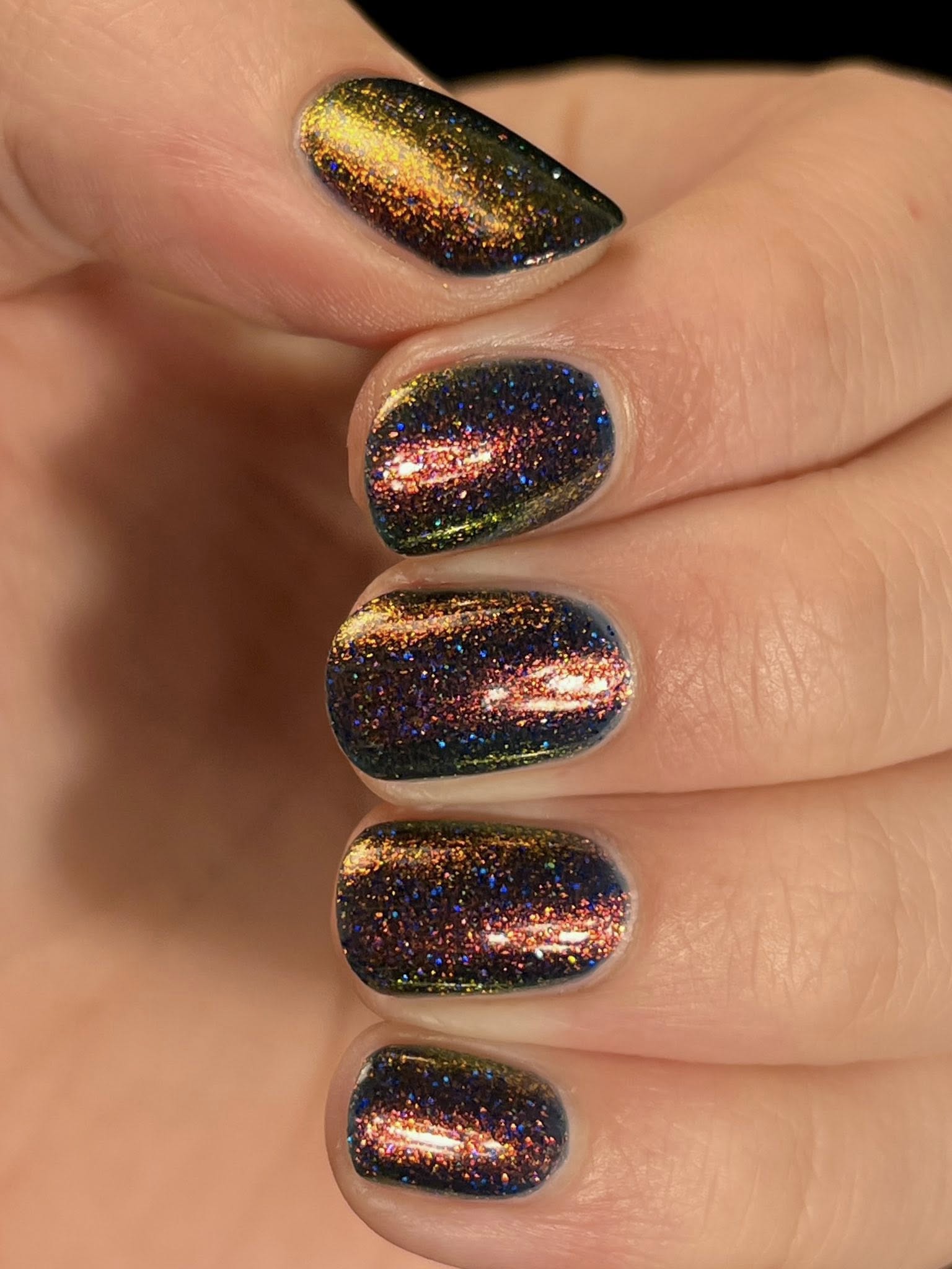 Undying love is our hidden bookshop polish for the month of July inspired by every Vampire love story because its too hard to pick only one! A blackened blue base saturated with a red to orange to purple shift, gold reflective and a scattered blue holo, this is a truly unique shade made for those who desire immortal love.