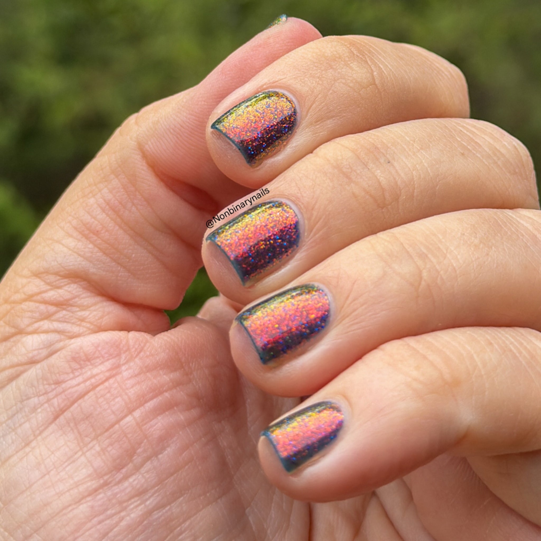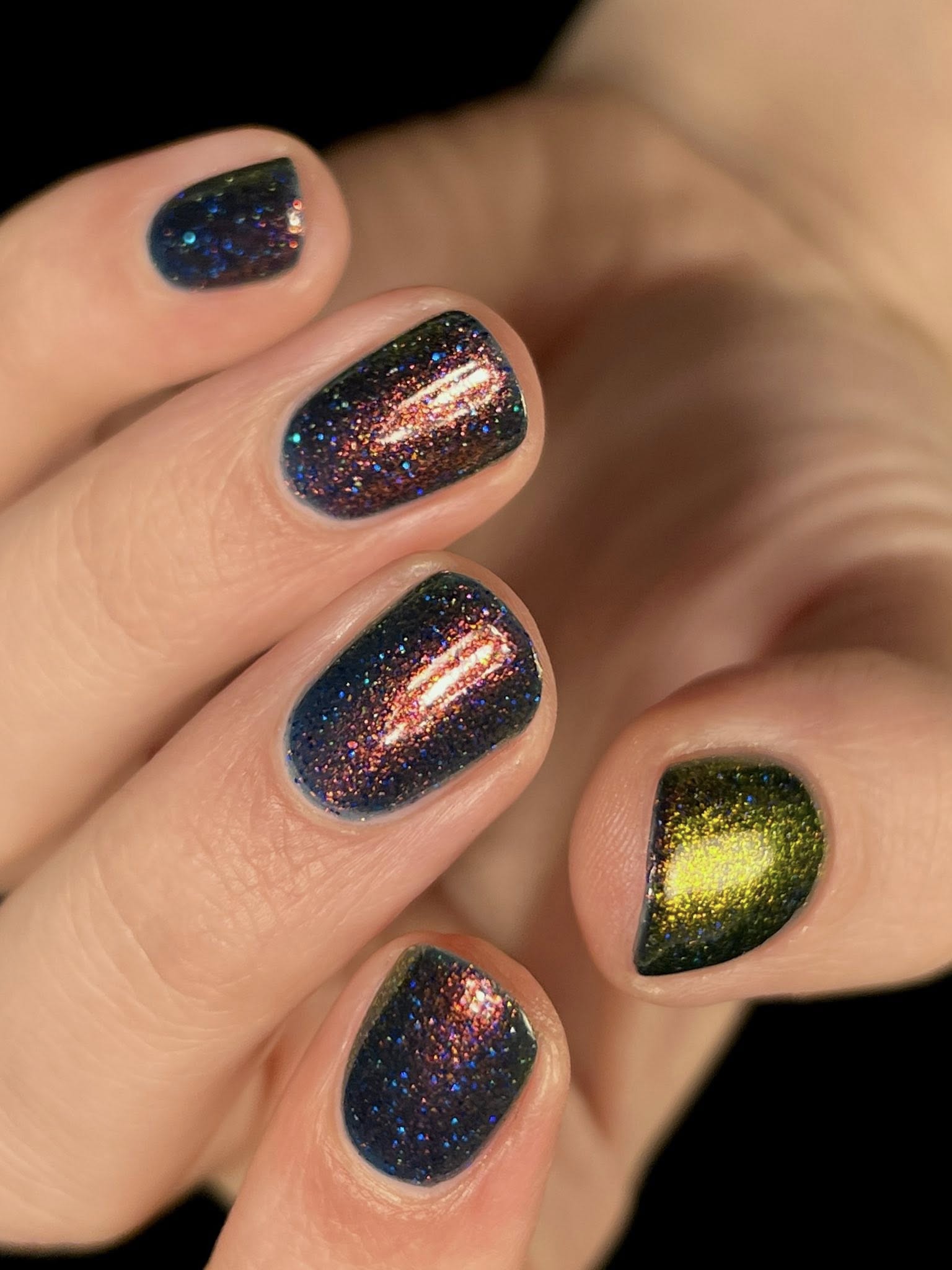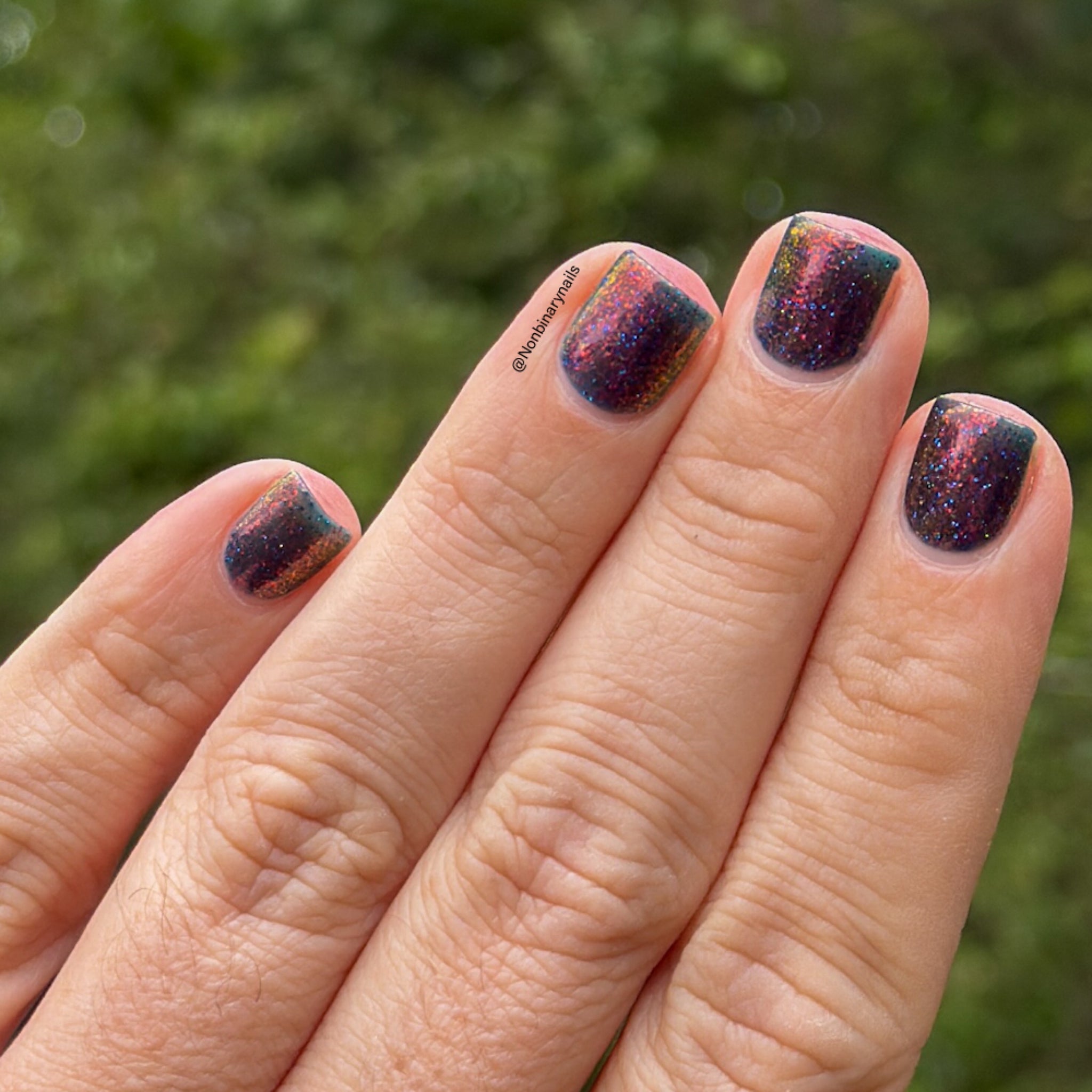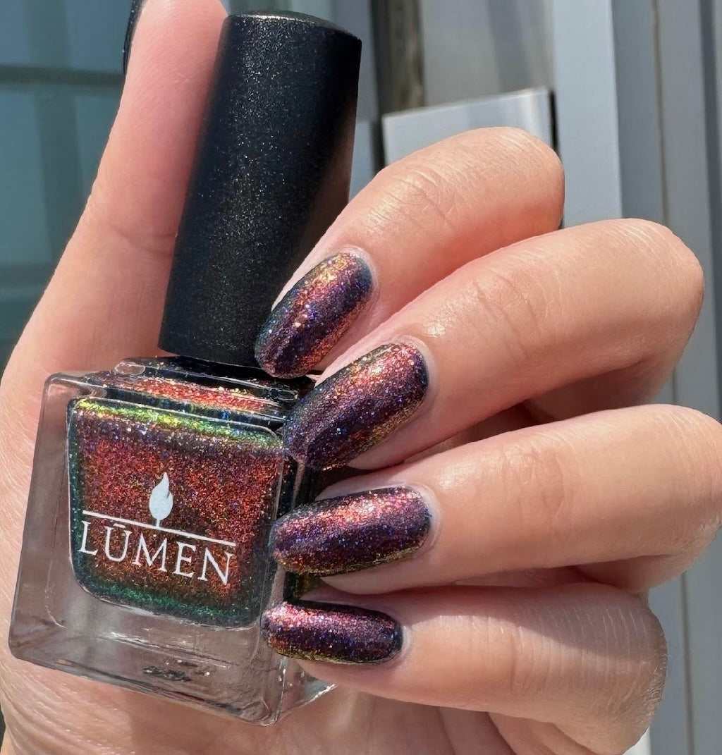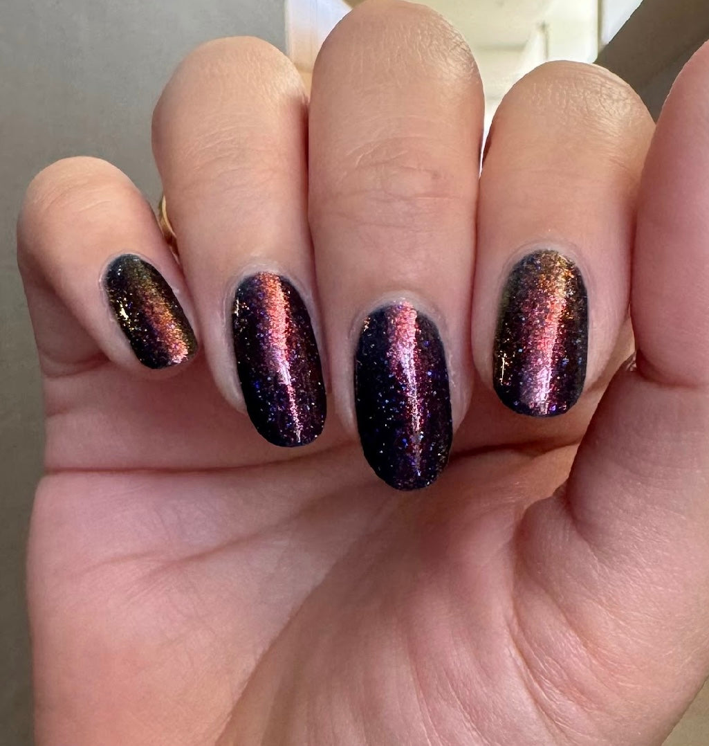 Undying love is our hidden bookshop polish for the month of July inspired by every Vampire love story because its too hard to pick only one! A blackened blue base saturated with a red to orange to purple shift, gold reflective and a scattered blue holo, this is a truly unique shade made for those who desire immortal love.
